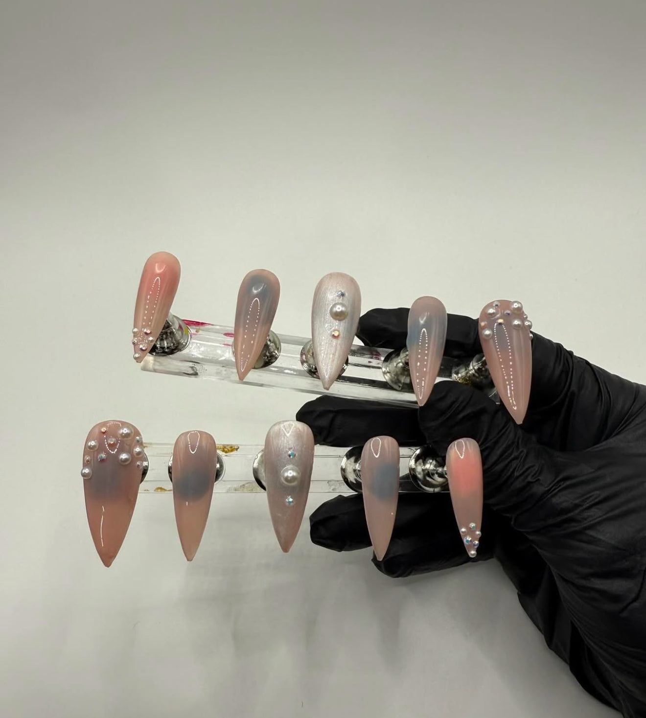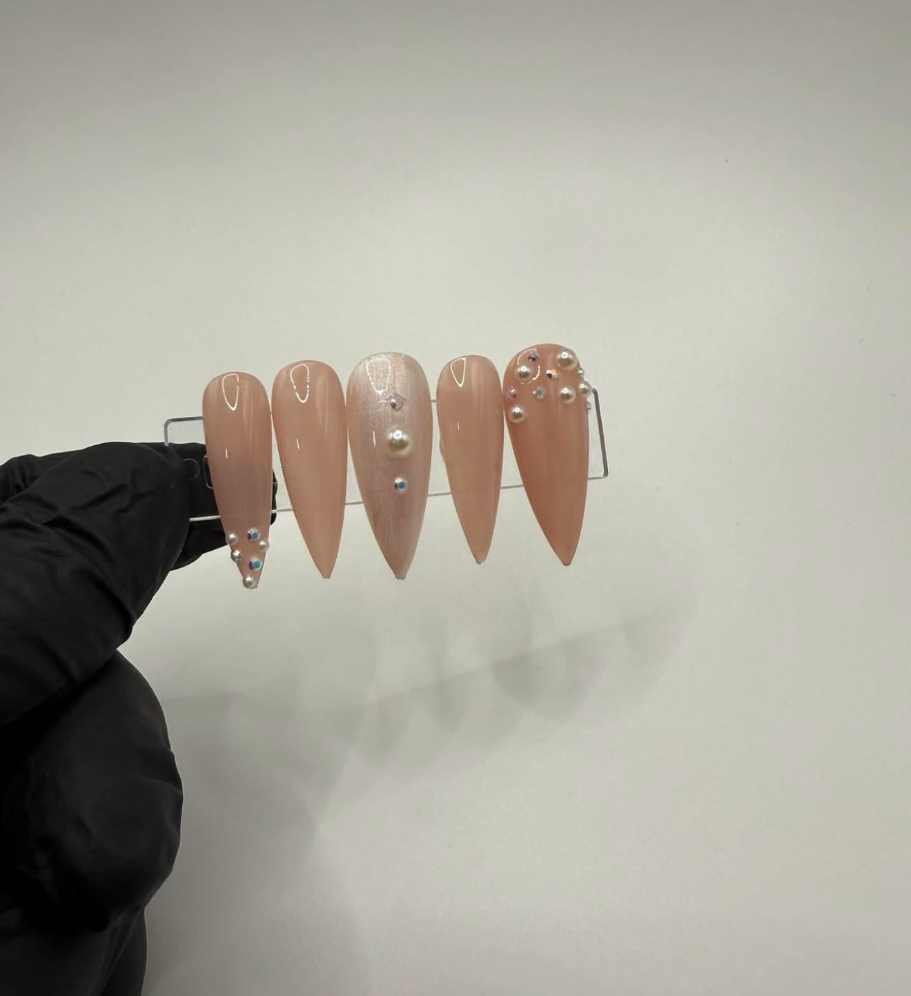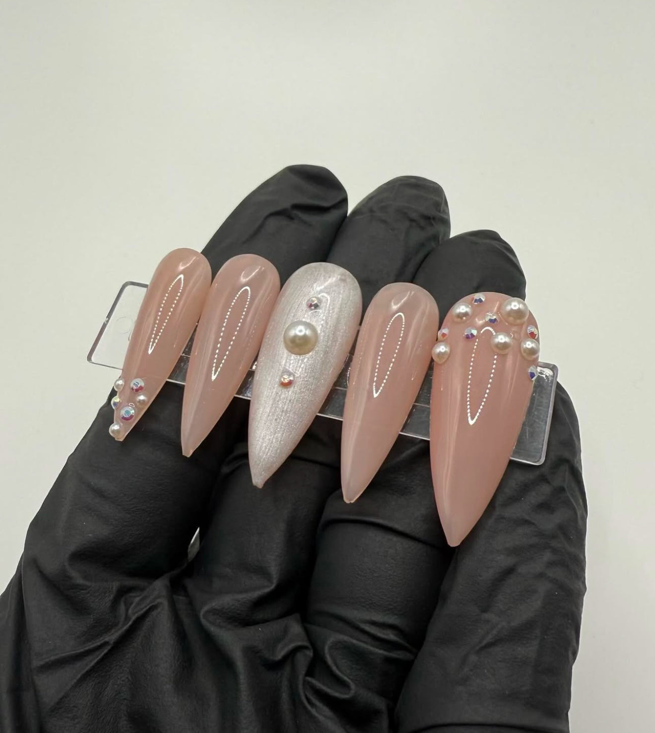 Set Shown Description: Nude Jelly Pink Toned Base Nails with Pearls & Diamonds Detailing . Slightly transparent.*