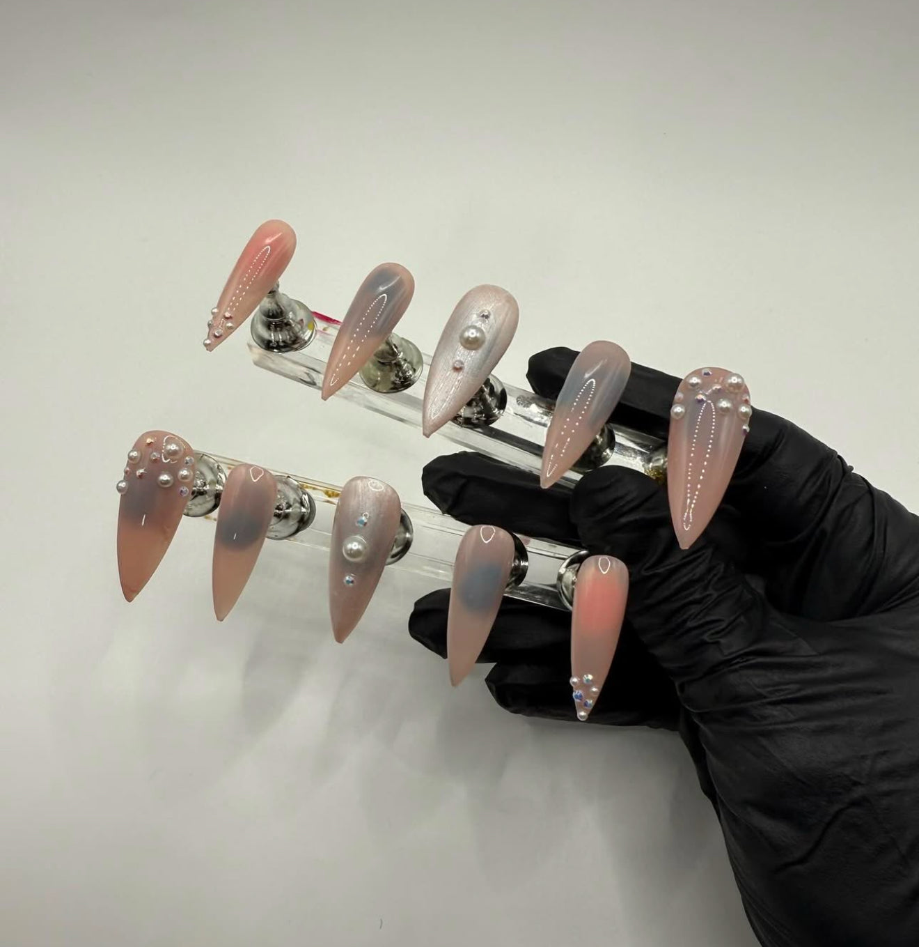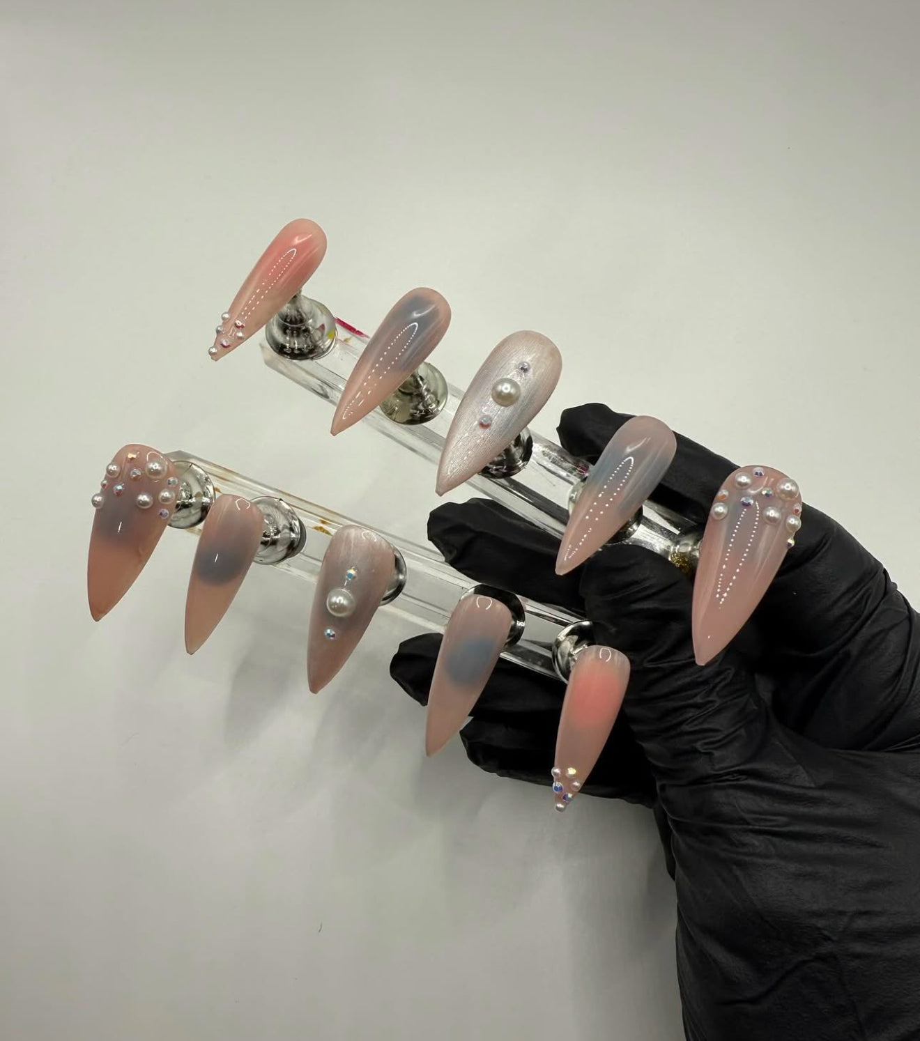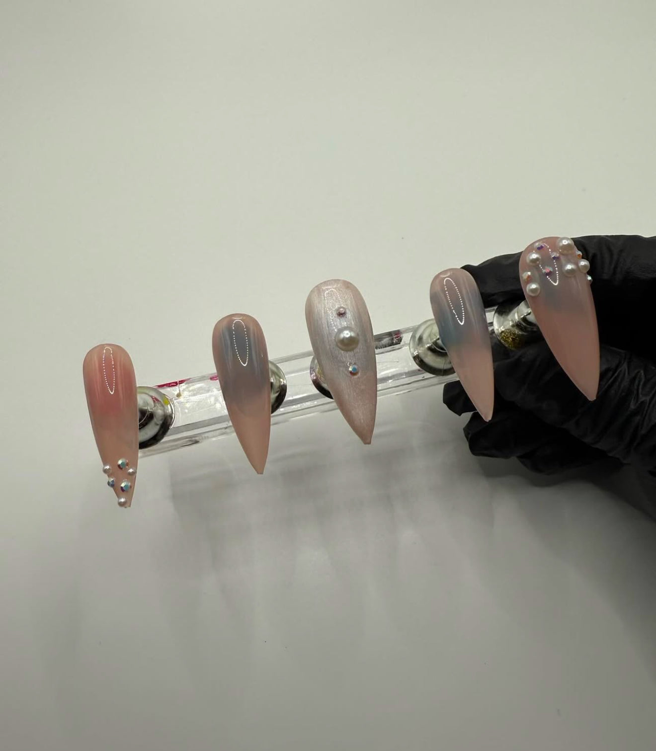 Set Shown Description: Nude Jelly Pink Toned Base Nails with Pearls & Diamonds Detailing . Slightly transparent.*