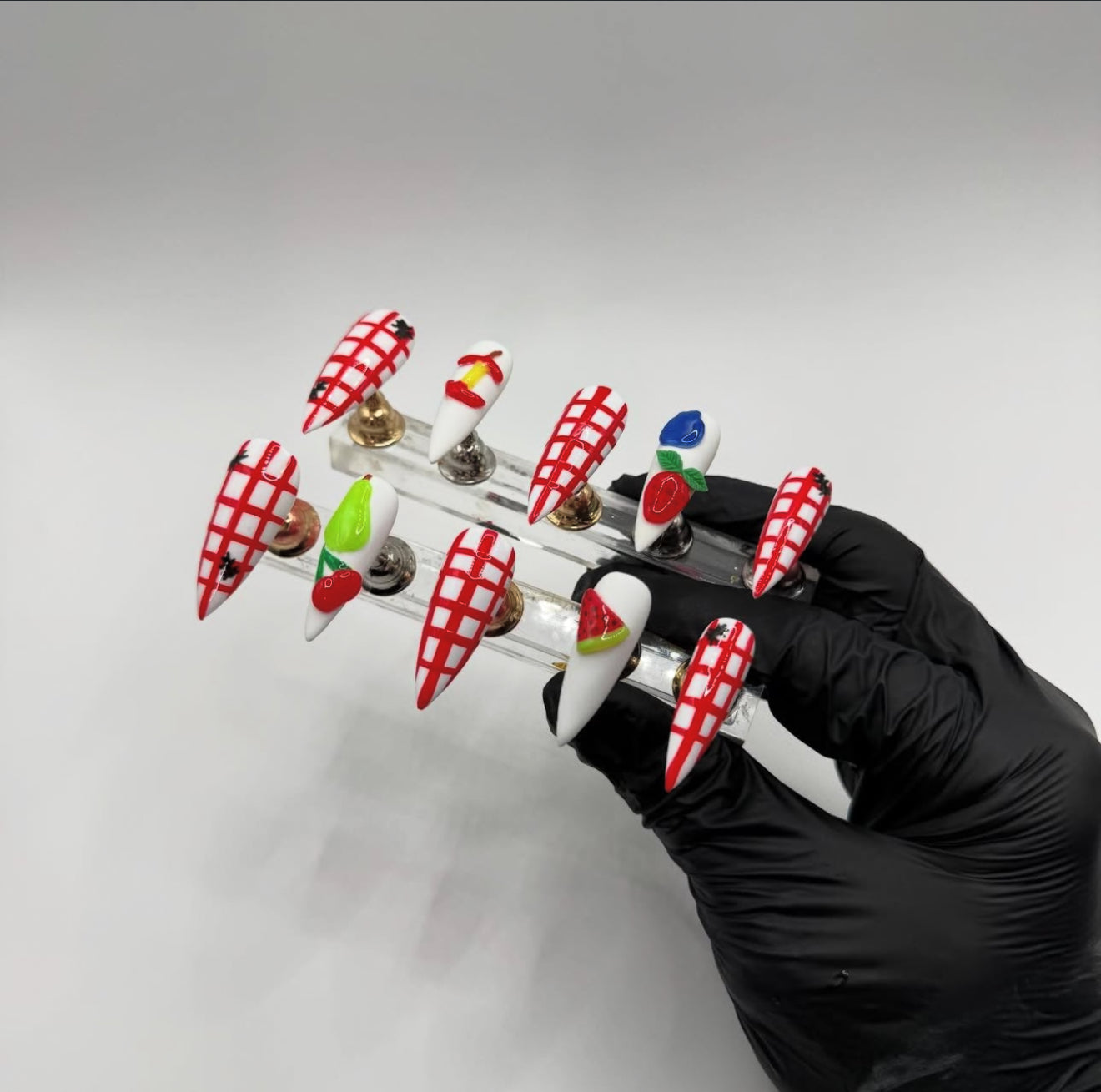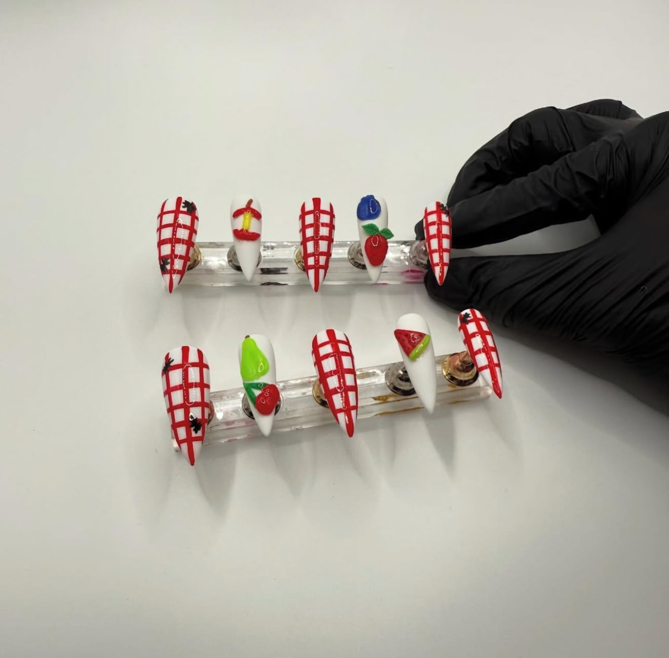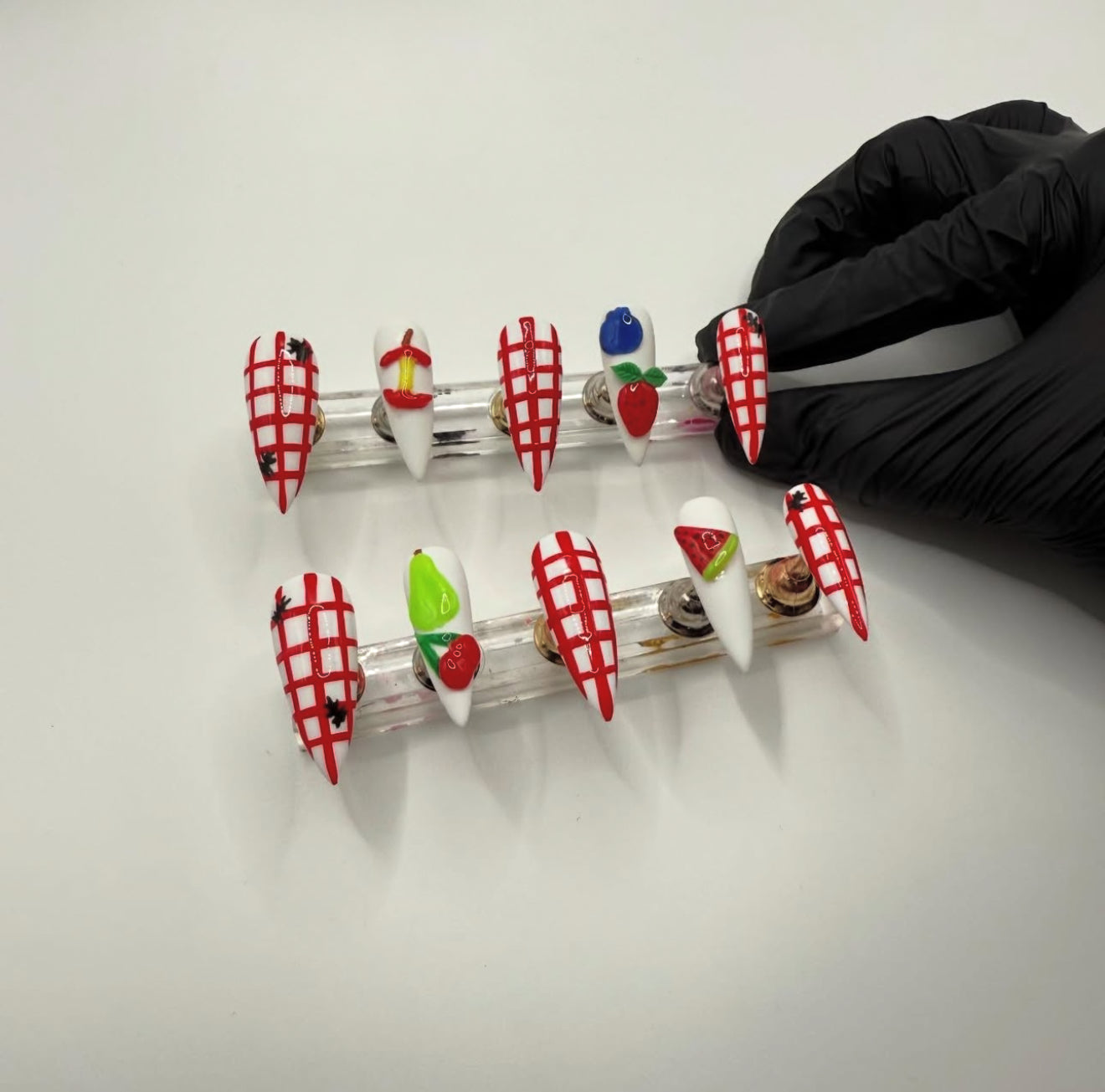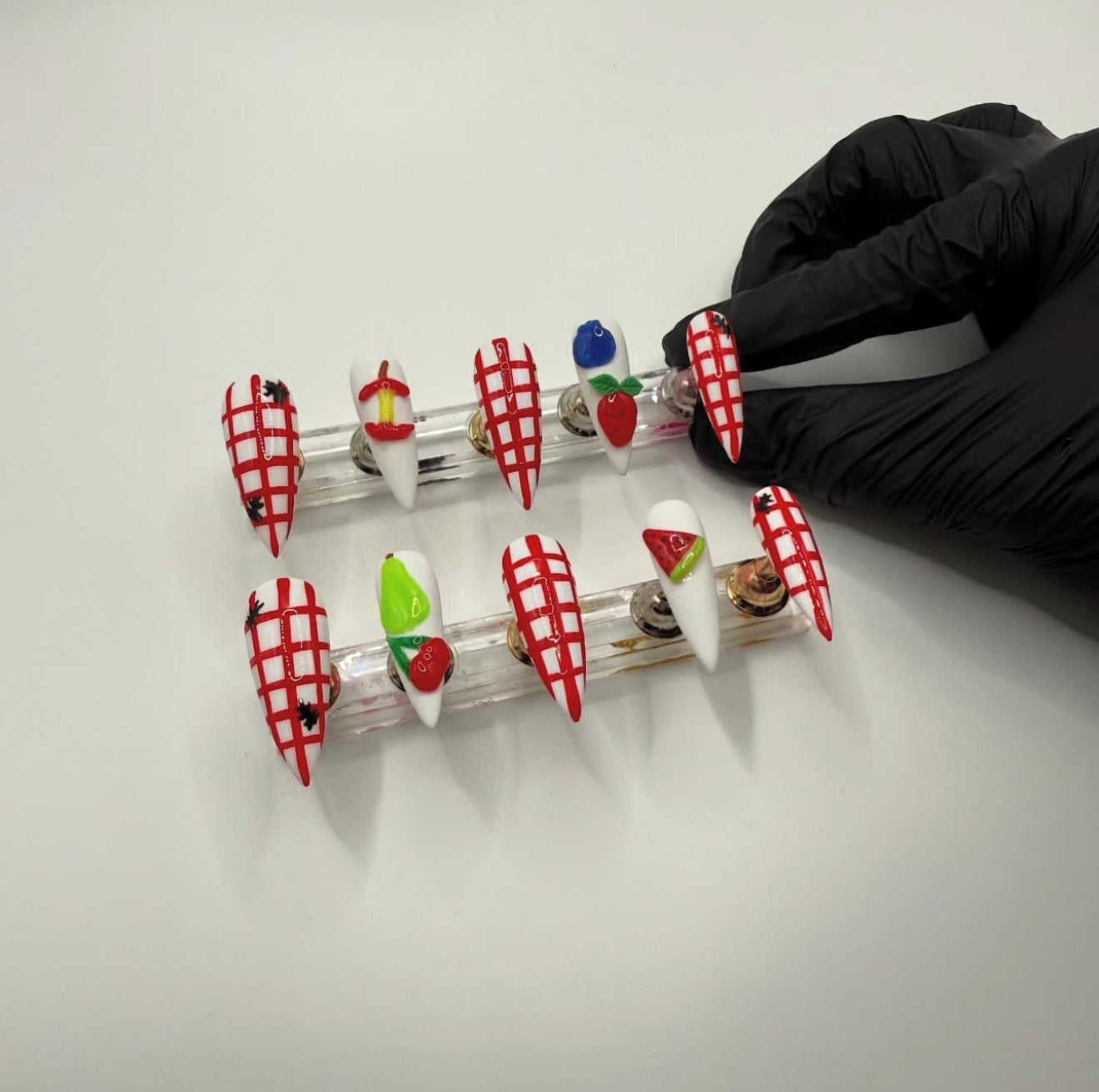 Set Shown Description: Glossy “Picnic Blanket Print” Red/White Nails with ANT details & Matte White nails with 3D sculpted fruit details.