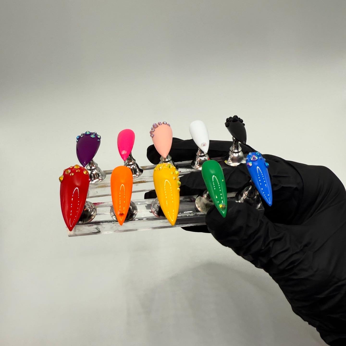 Set Shown Description: Each nail is a different color of the rainbow with MATCHING, assorted sized stones.