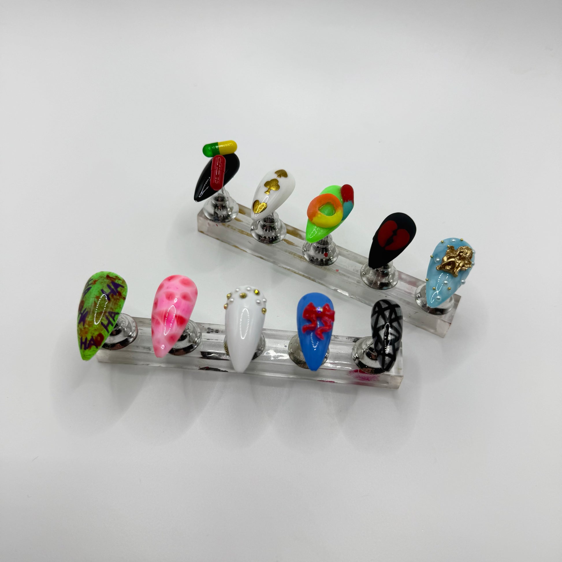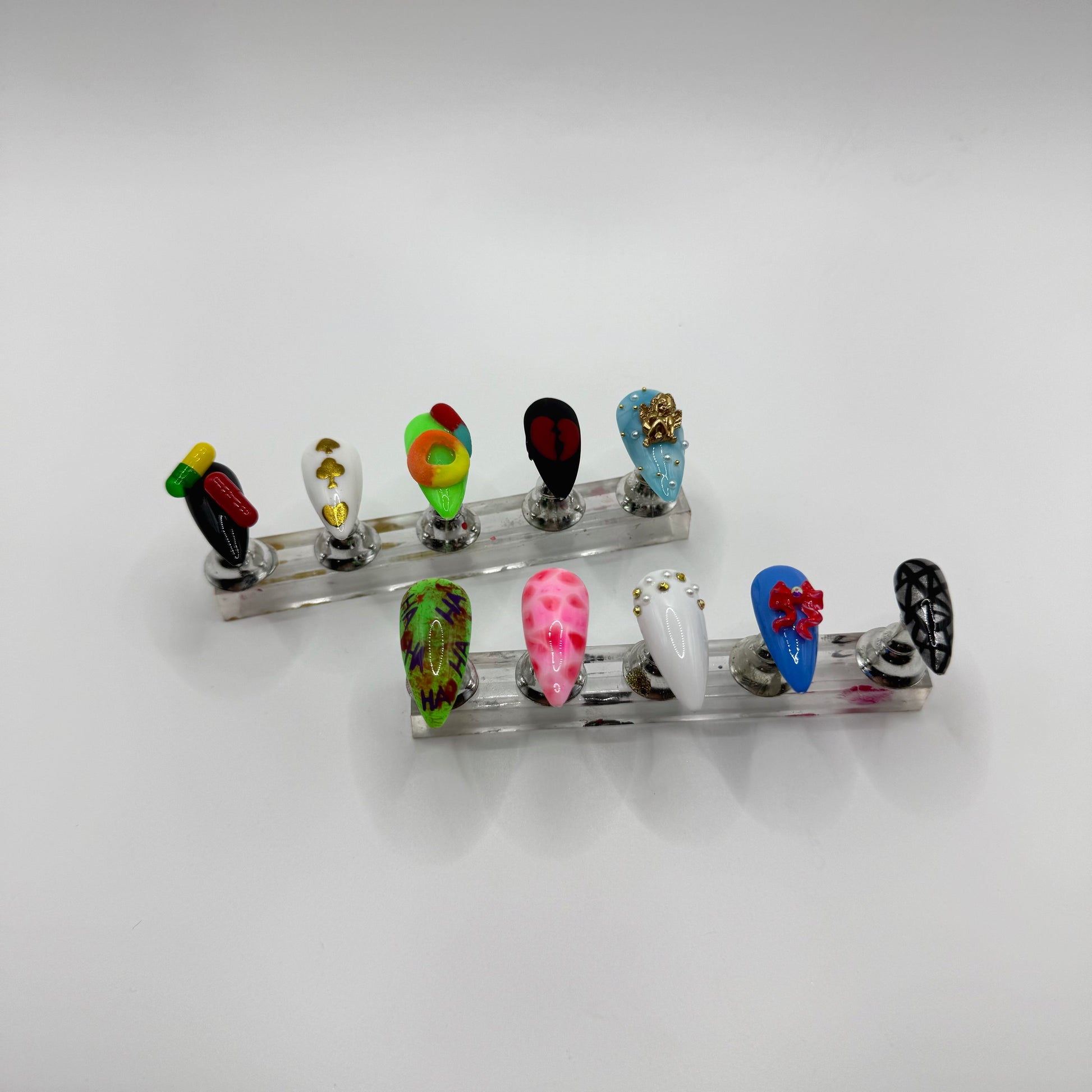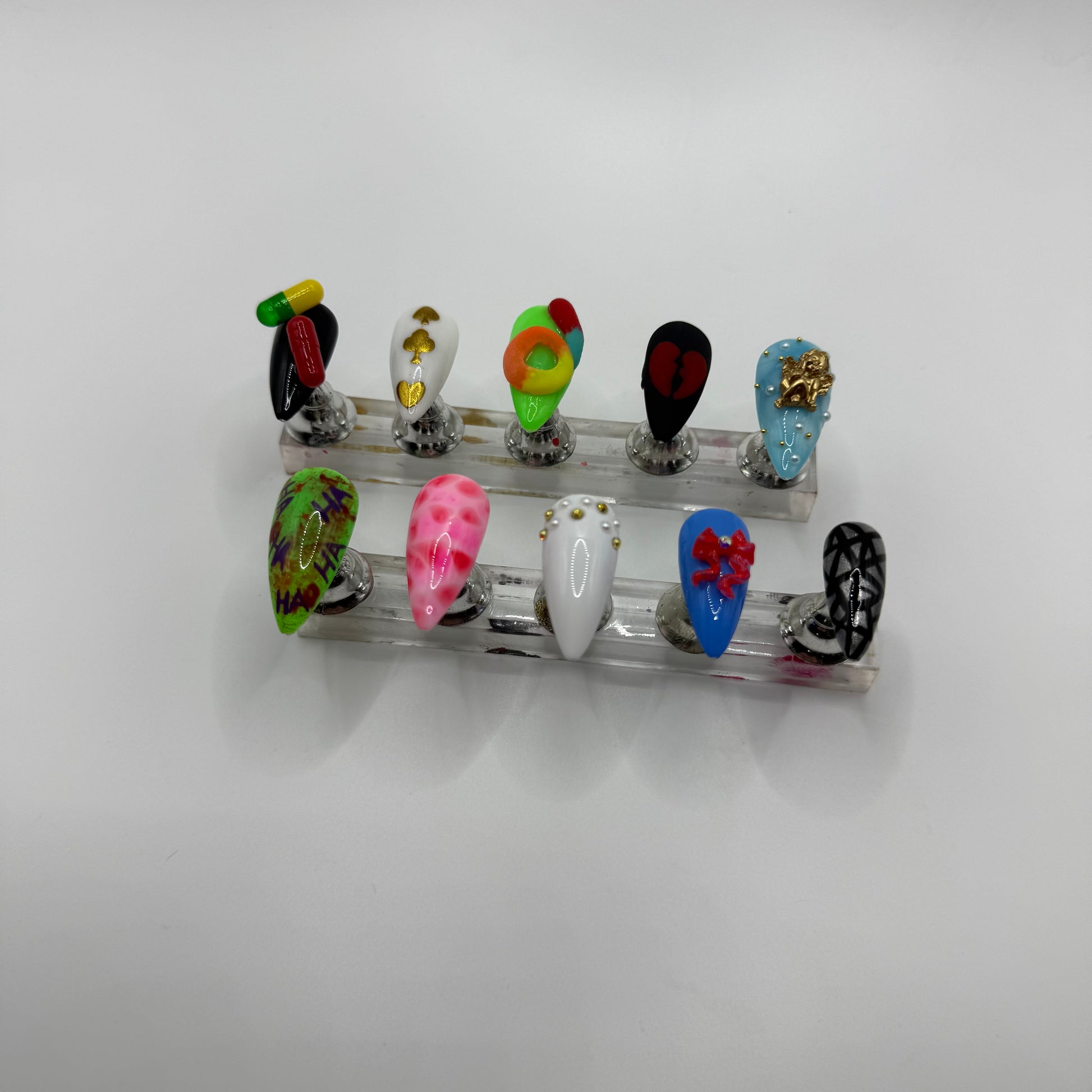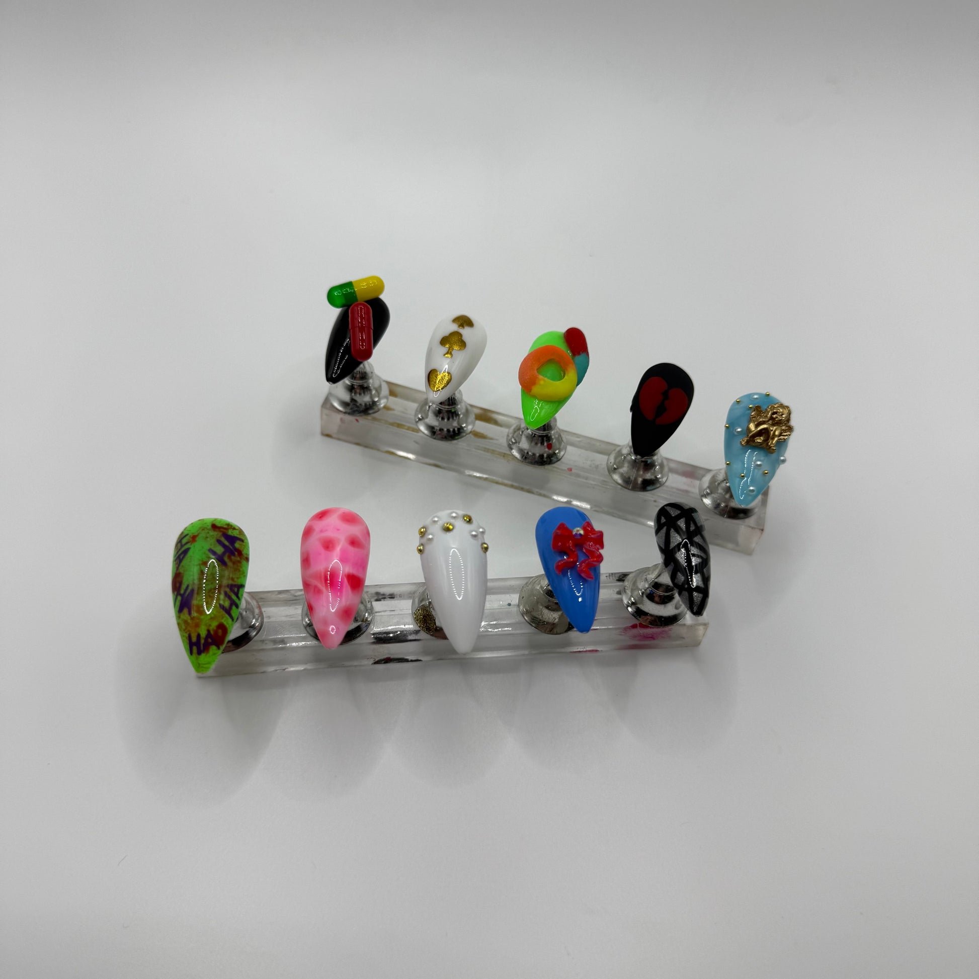 Set Includes: Black/Pill nail, White/Gold chrome poker symbols nail, Green/3D sour candy nail, Matte black/red broken heart nail, Blue/White “cloud”/angel charm nail, Joker Nail, meat dress nail, white/gold stones+pearls nail, blue/red bow nail, and black/chrome “broken mirror” nail.