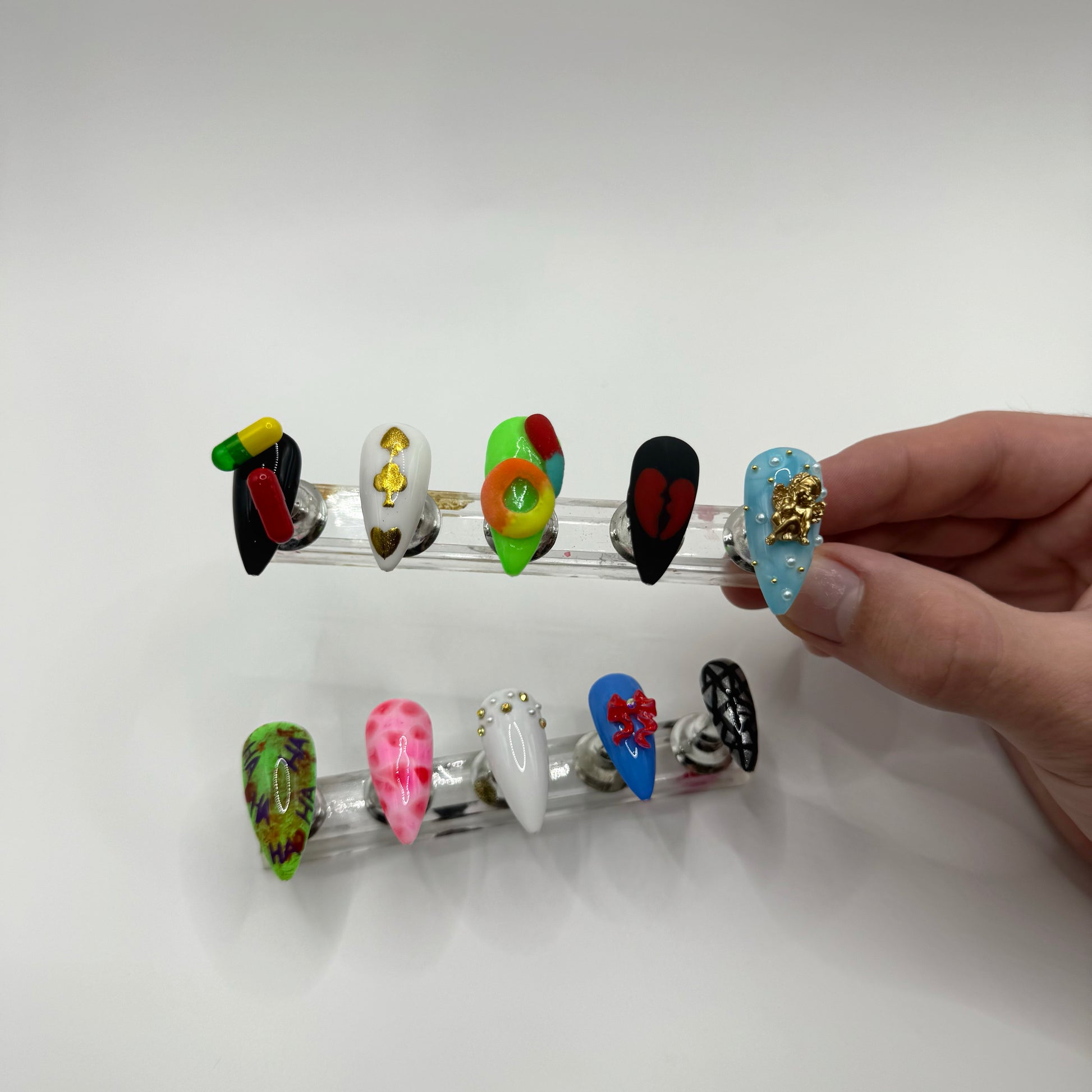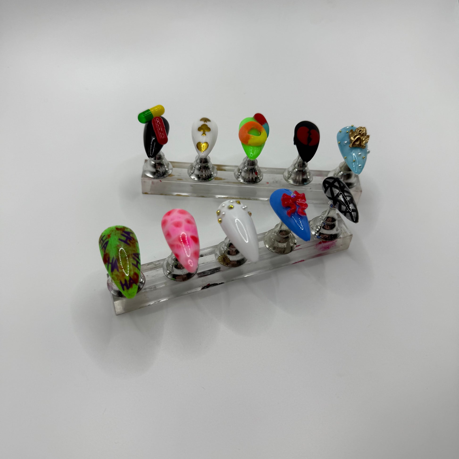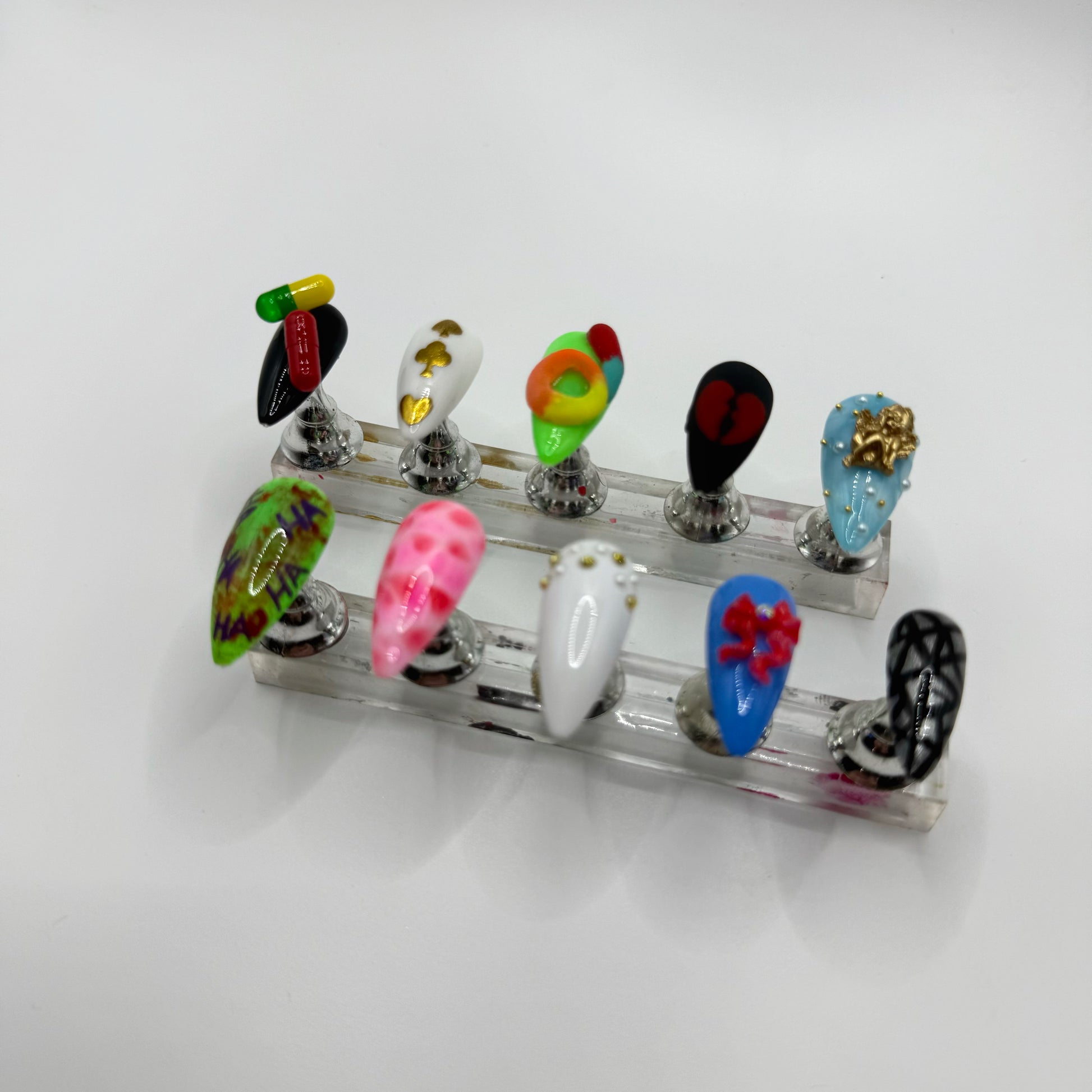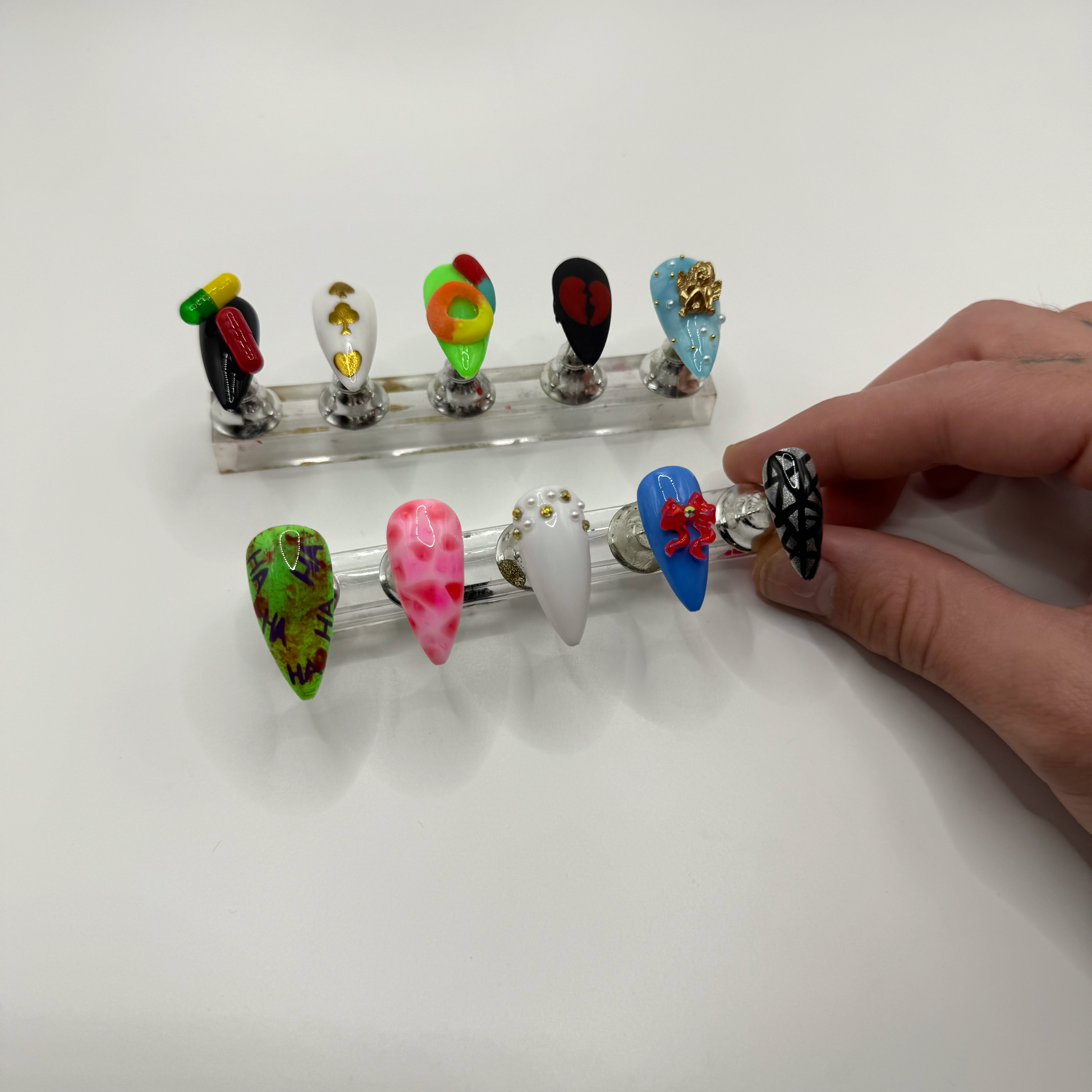 Set Includes: Black/Pill nail, White/Gold chrome poker symbols nail, Green/3D sour candy nail, Matte black/red broken heart nail, Blue/White “cloud”/angel charm nail, Joker Nail, meat dress nail, white/gold stones+pearls nail, blue/red bow nail, and black/chrome “broken mirror” nail.