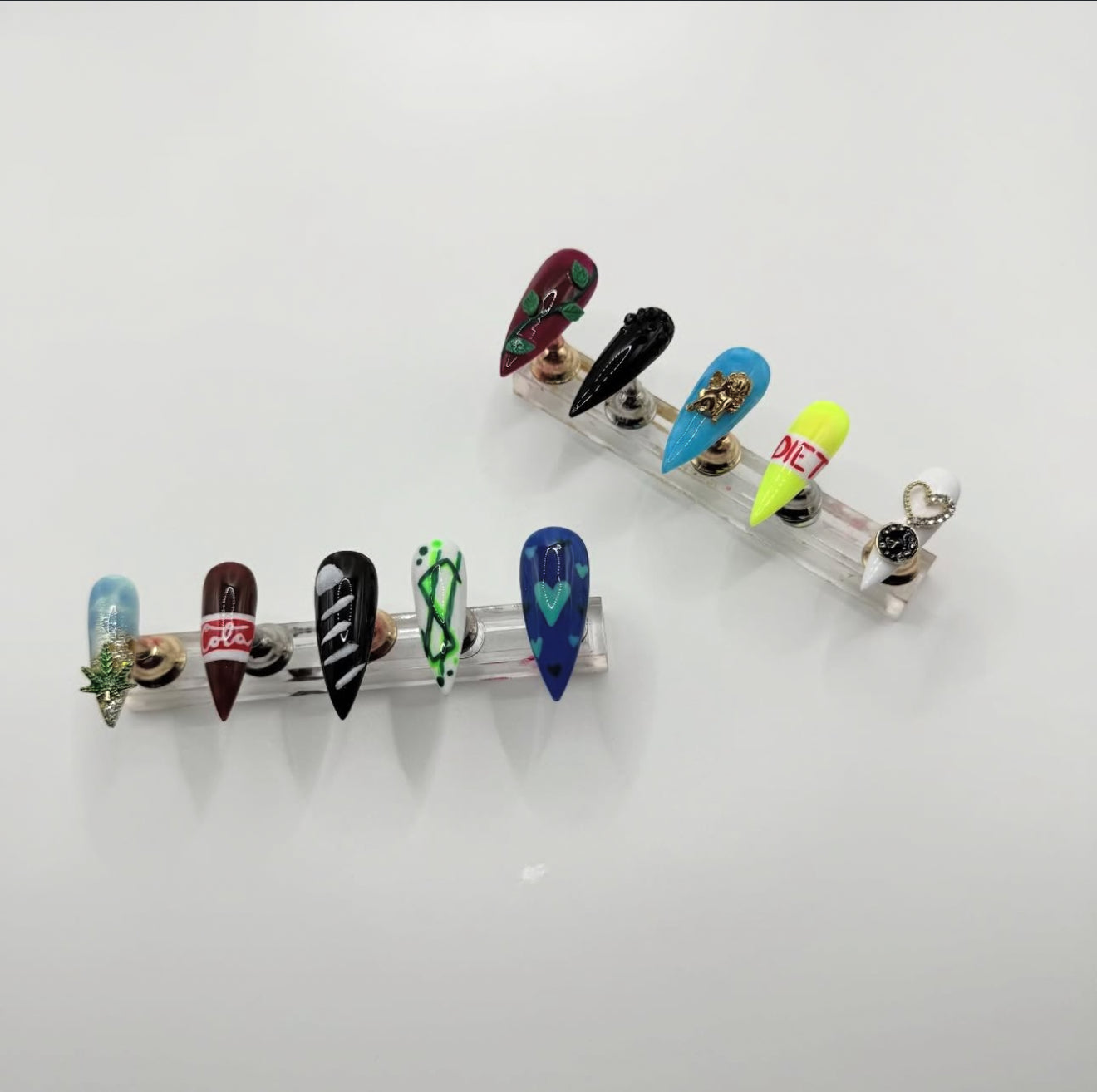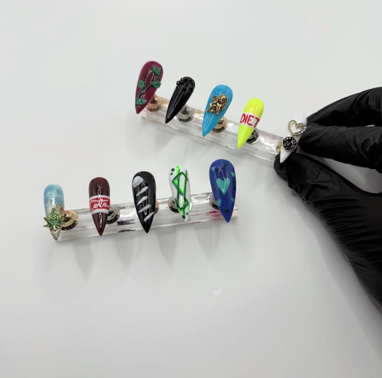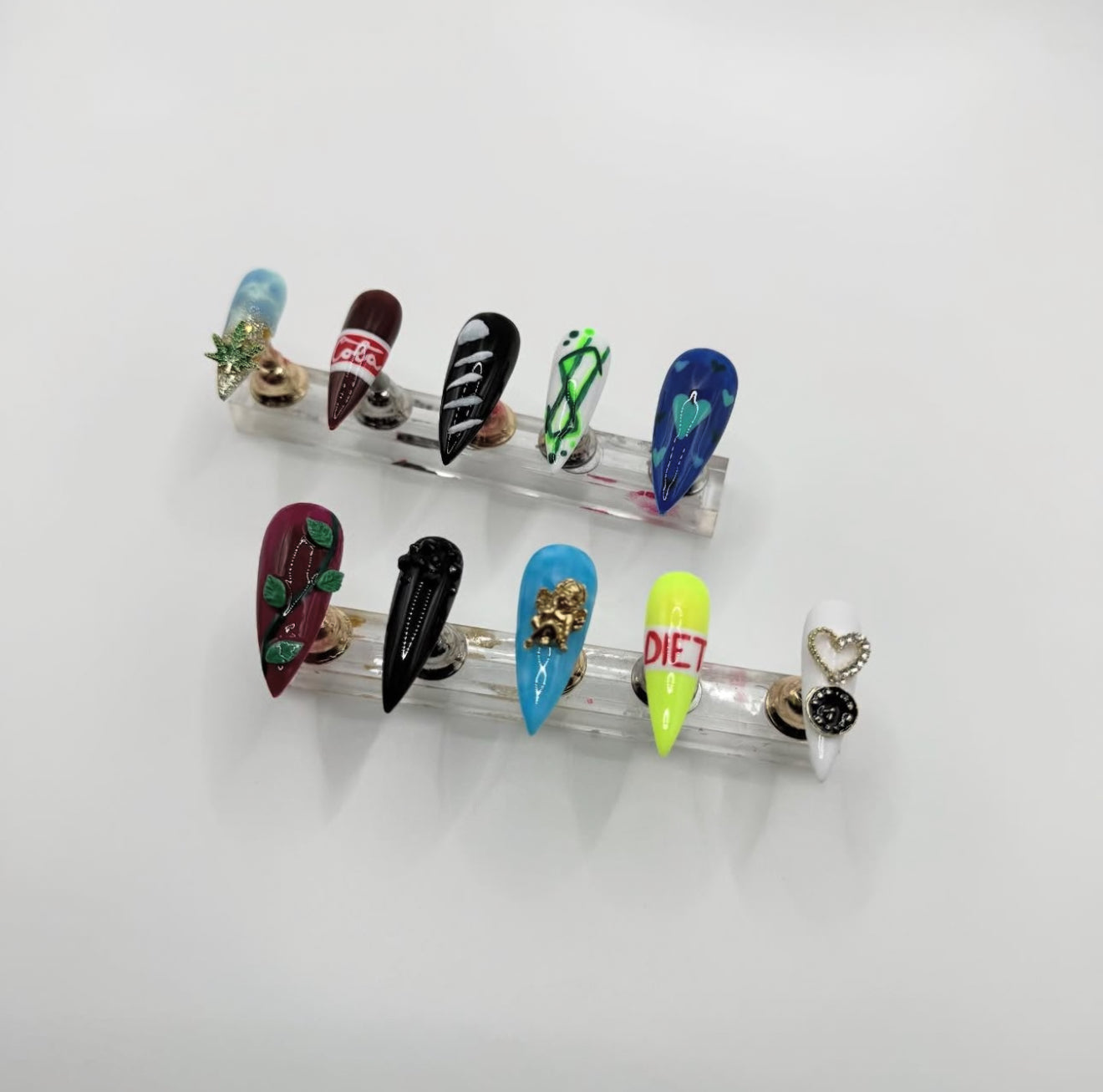 Set Includes: Beach/Shore Nail with Glitter/Leaf Charm, Cola Nail, Black with “lines” nail, White with Money Sign nail, Blue with Blue Hearts nail, Red with “poison ivy” nail, black with black rhinestones nail, blue/white “cloud” with angel charm nail, Diet MtnDew nail, & white with heart/clock charms.