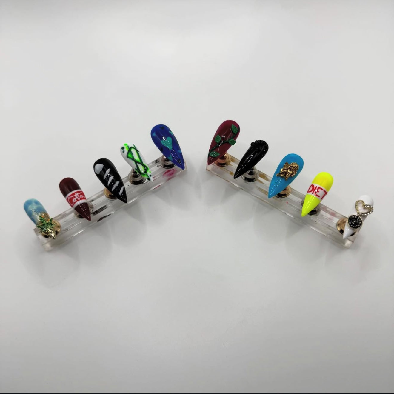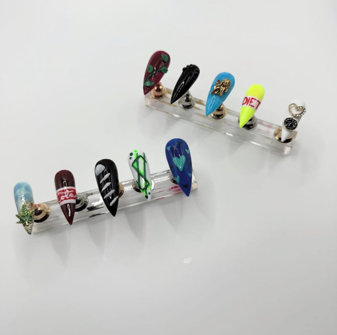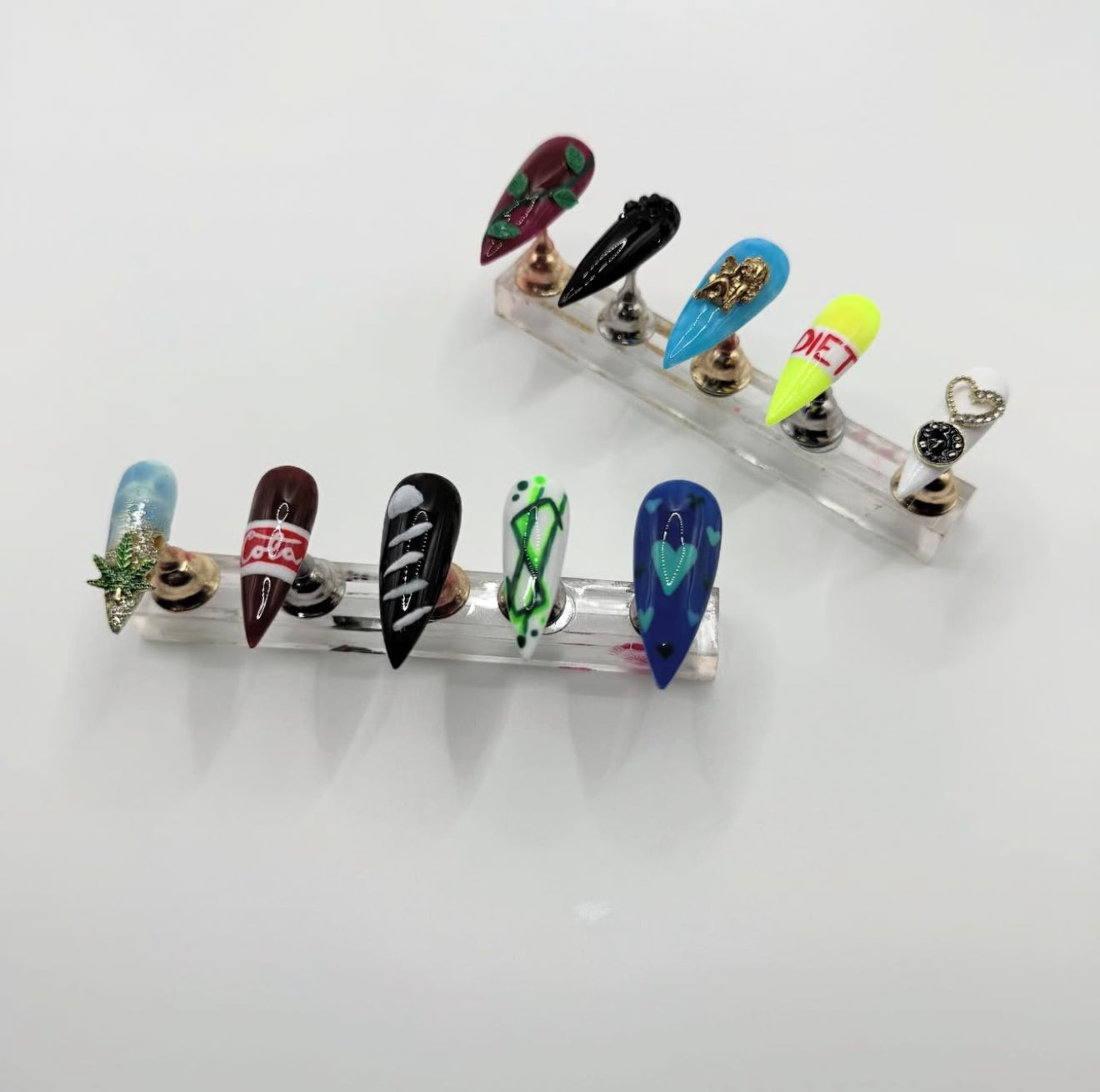 Set Includes: Beach/Shore Nail with Glitter/Leaf Charm, Cola Nail, Black with “lines” nail, White with Money Sign nail, Blue with Blue Hearts nail, Red with “poison ivy” nail, black with black rhinestones nail, blue/white “cloud” with angel charm nail, Diet MtnDew nail, & white with heart/clock charms.