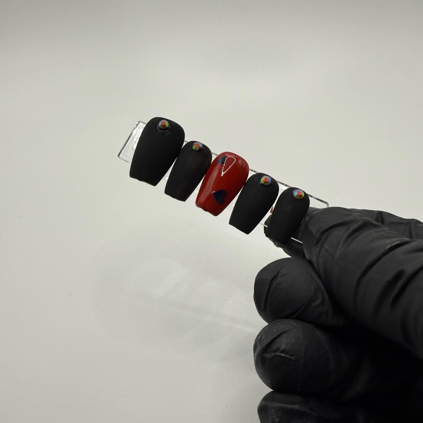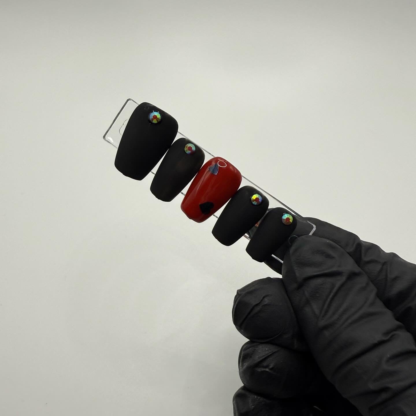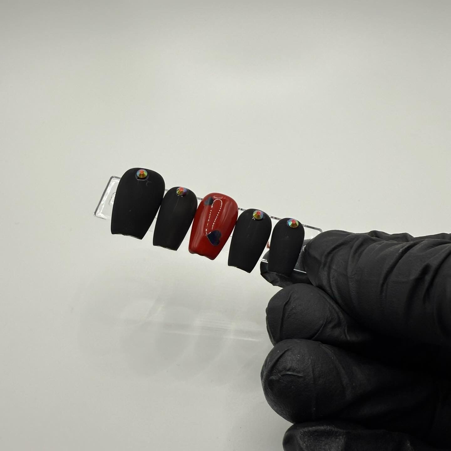 Set Shown Description: Matte Black Nails+AB Red Rhinestones with Glossy Red+ Black Holographic Heart Accent Nails.