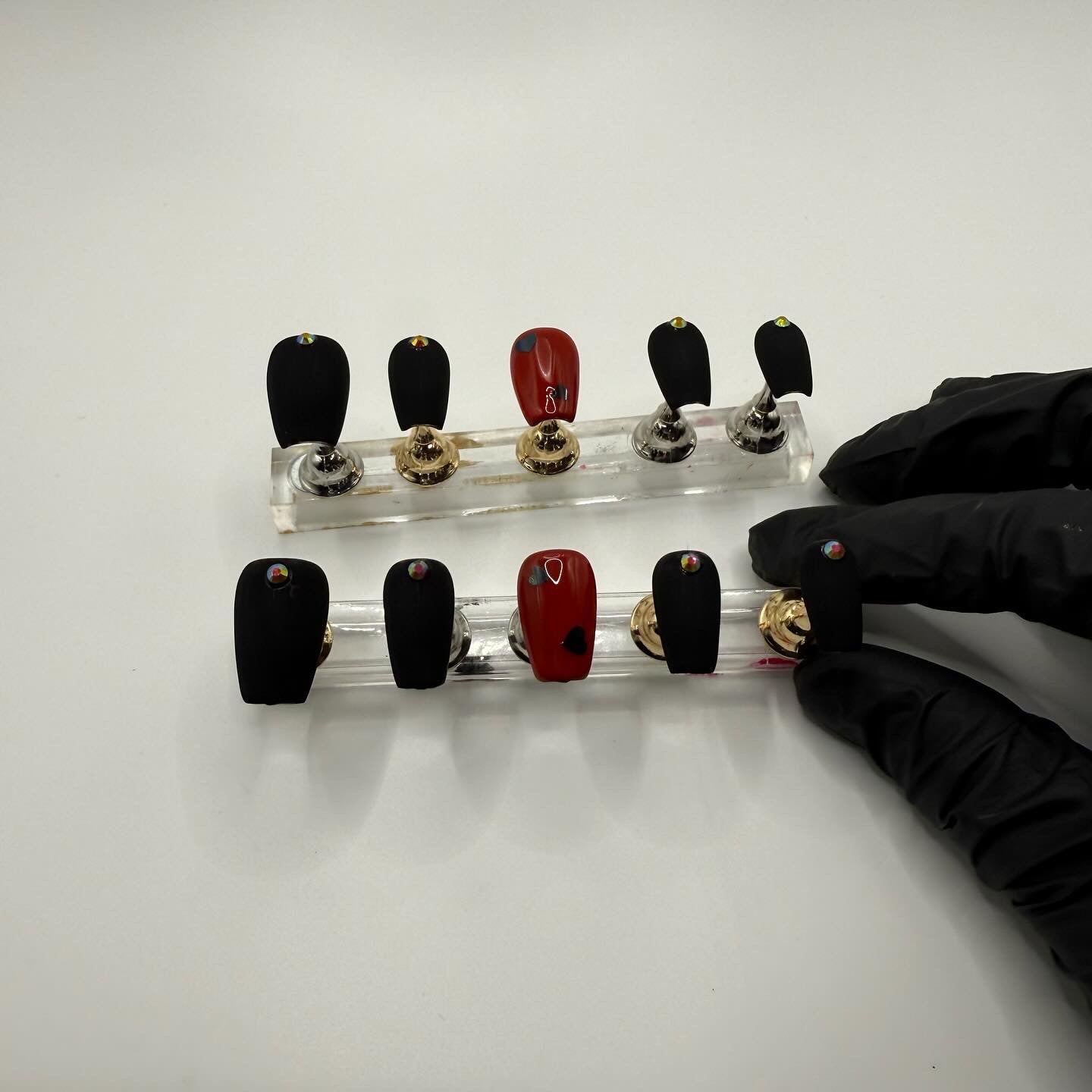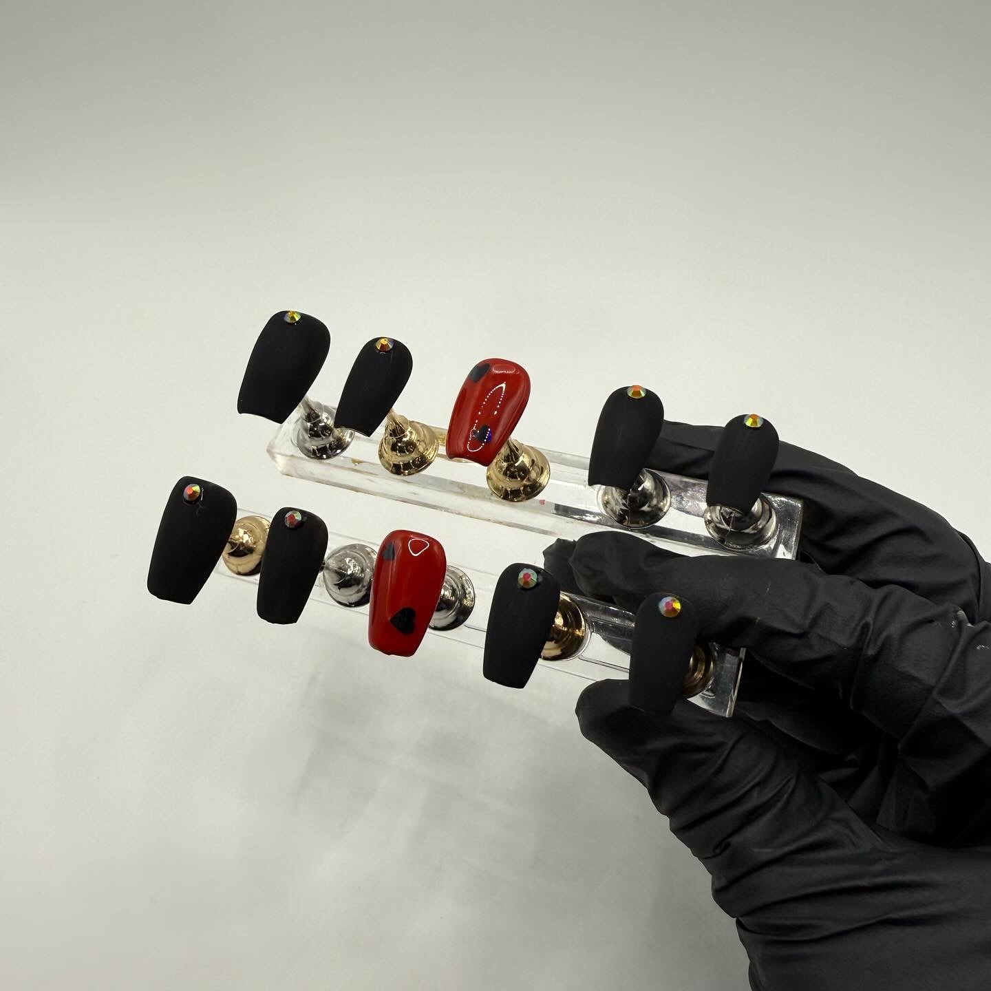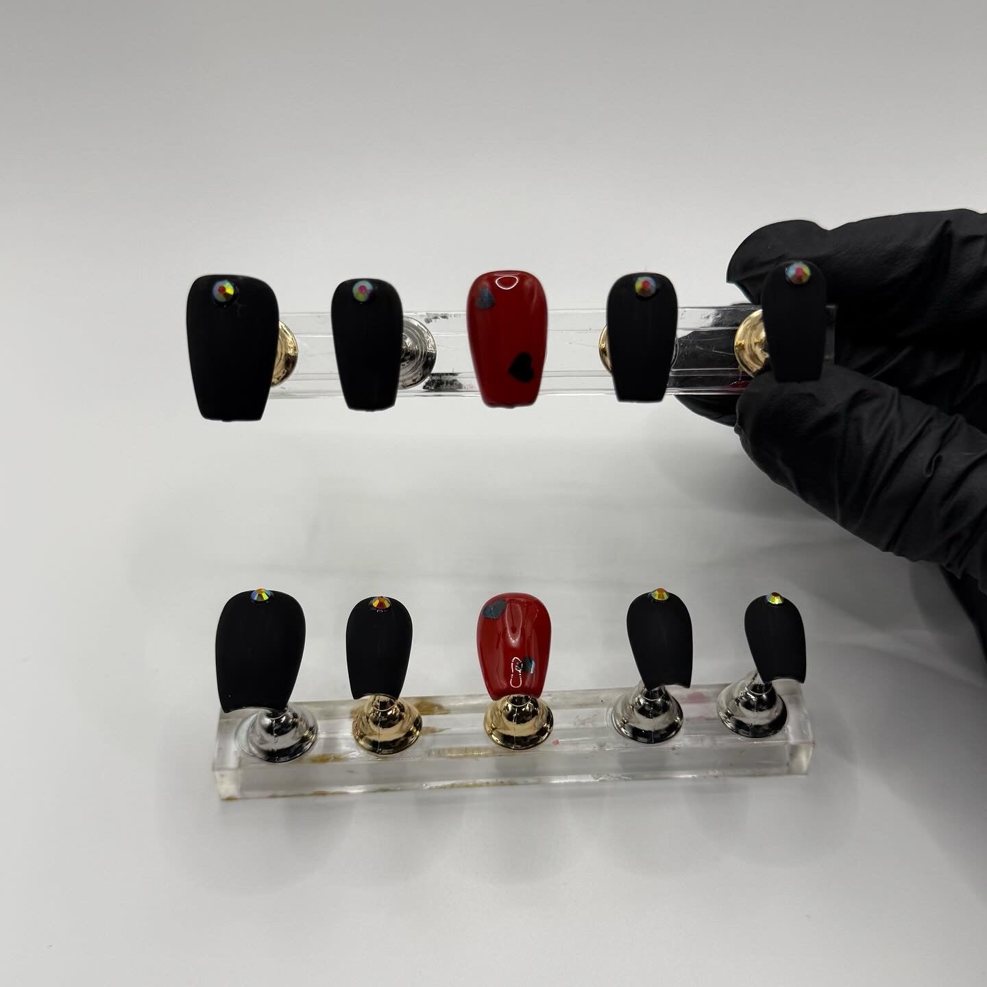 Set Shown Description: Matte Black Nails+AB Red Rhinestones with Glossy Red+ Black Holographic Heart Accent Nails.