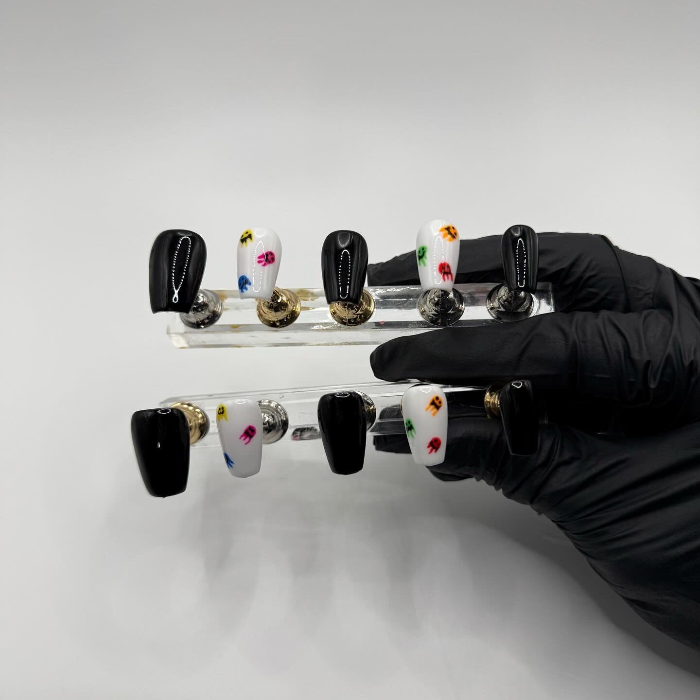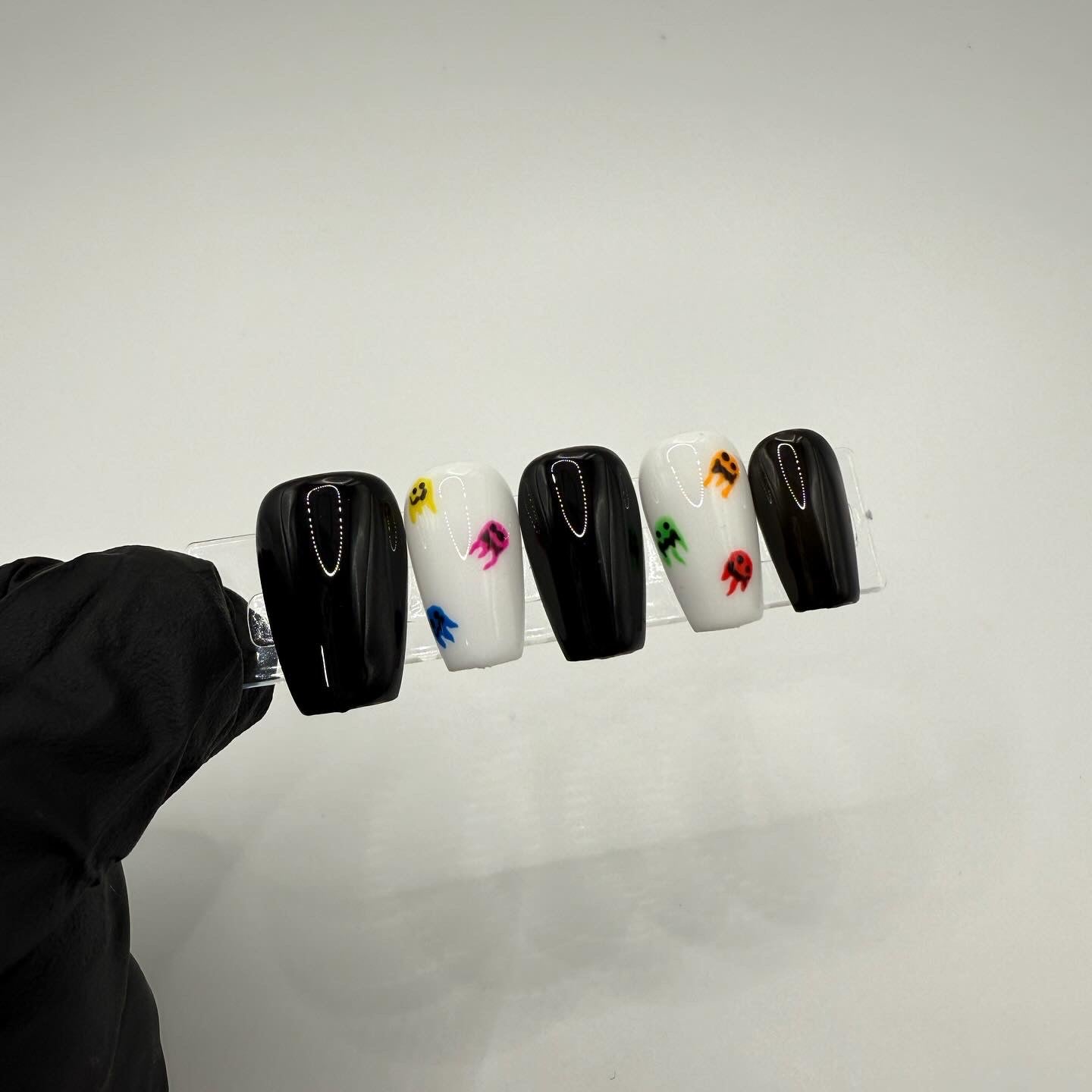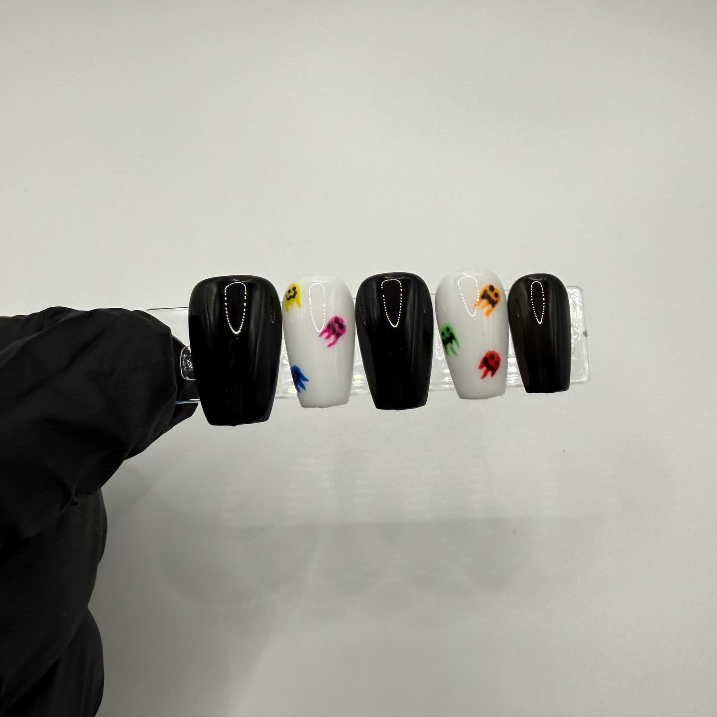 Set Shown Description: Glossy Black/White Nails with Rainbow Melting Smiley Face Details
