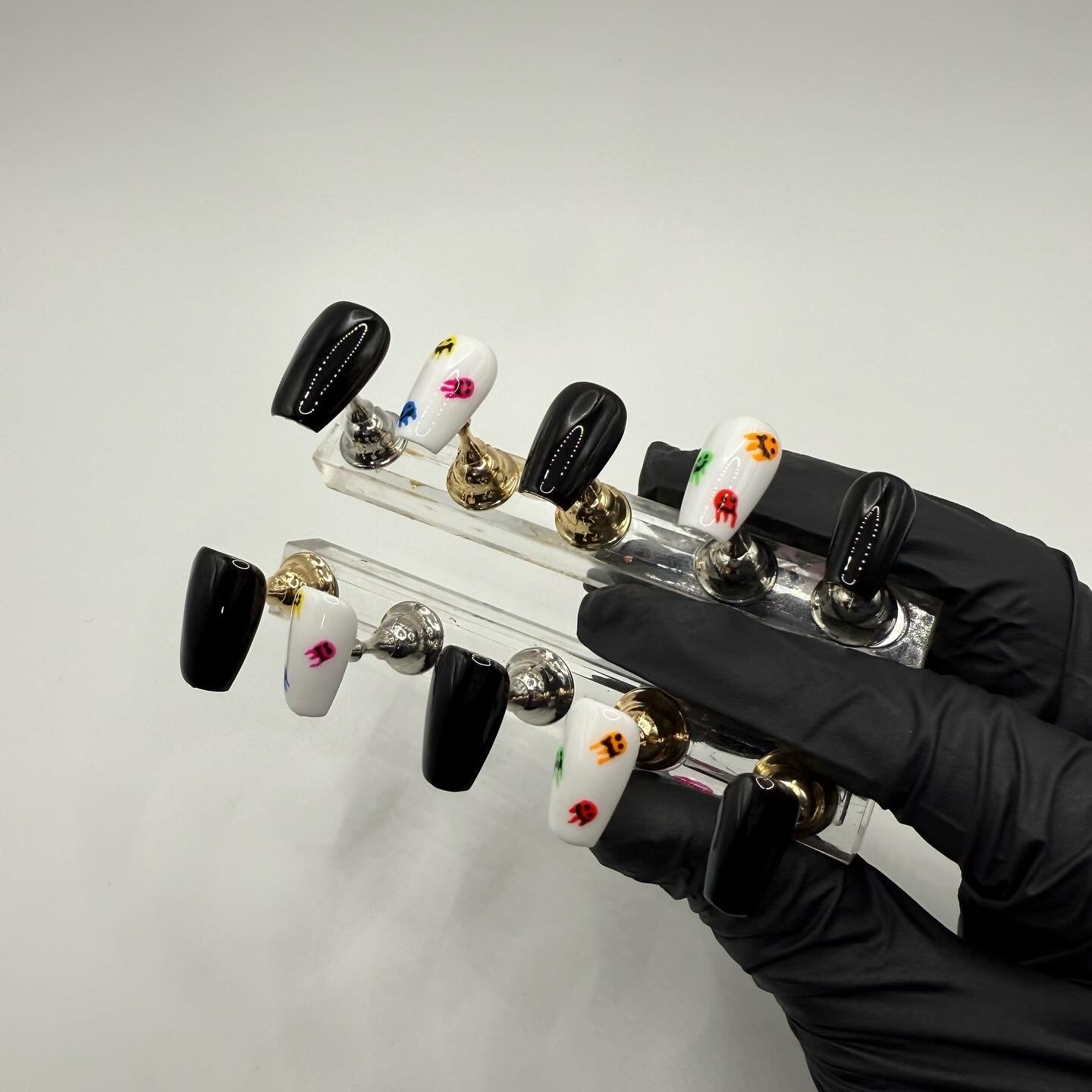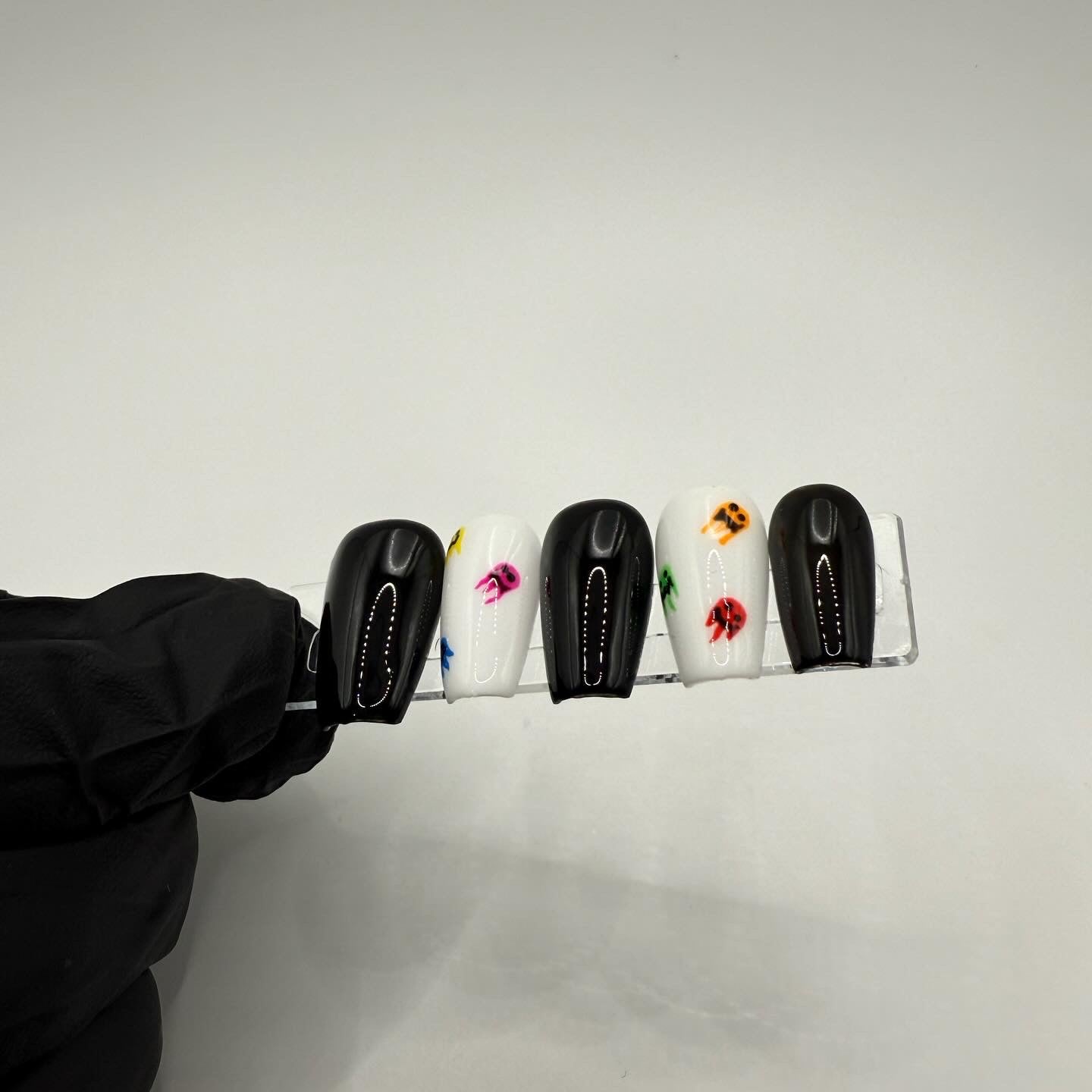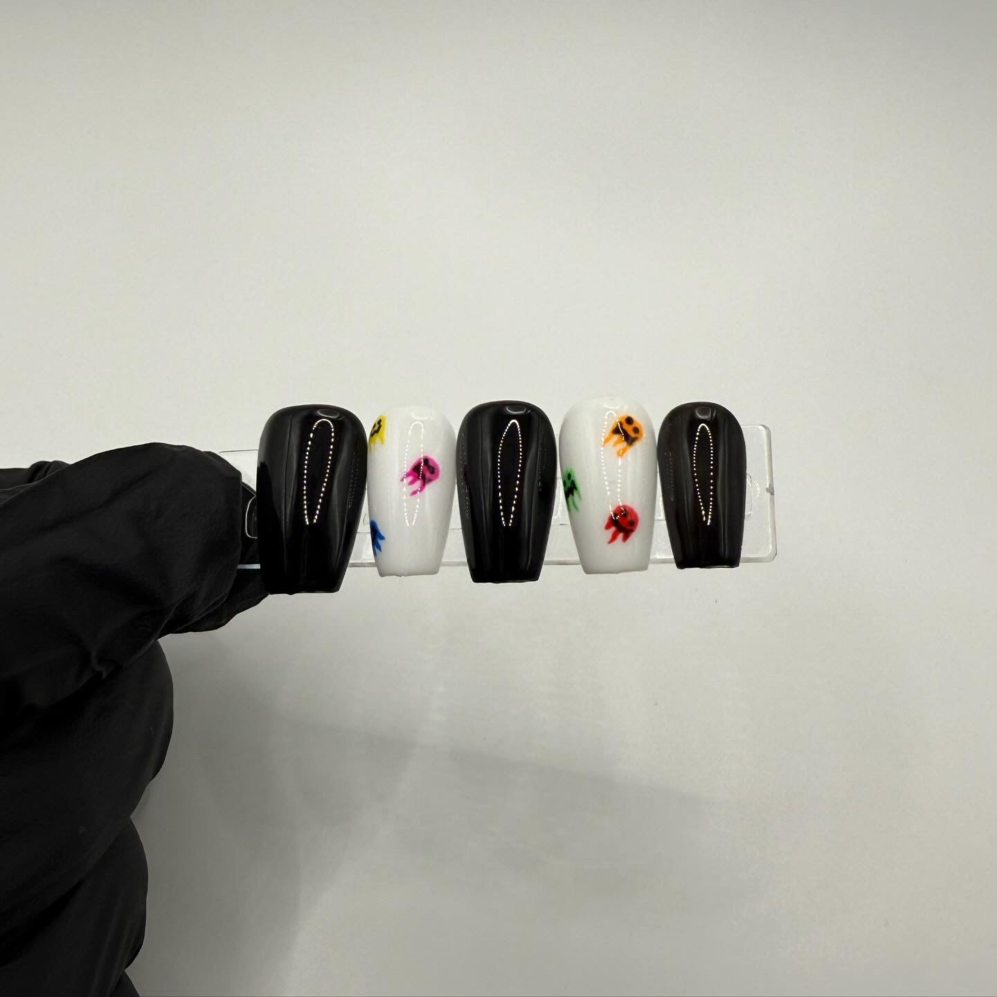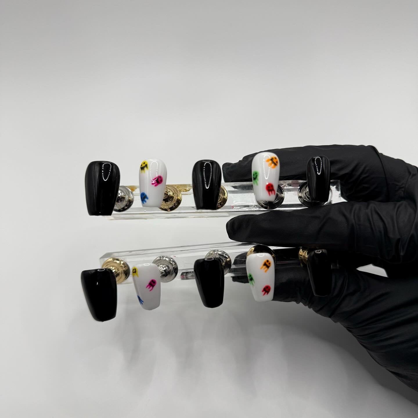 Set Shown Description: Glossy Black/White Nails with Rainbow Melting Smiley Face Details