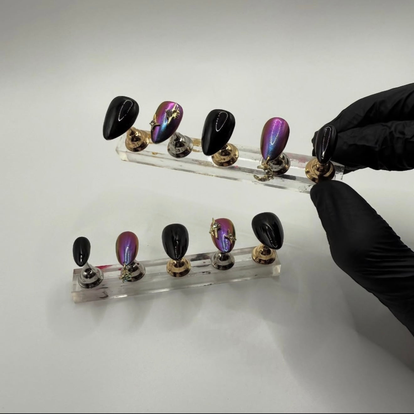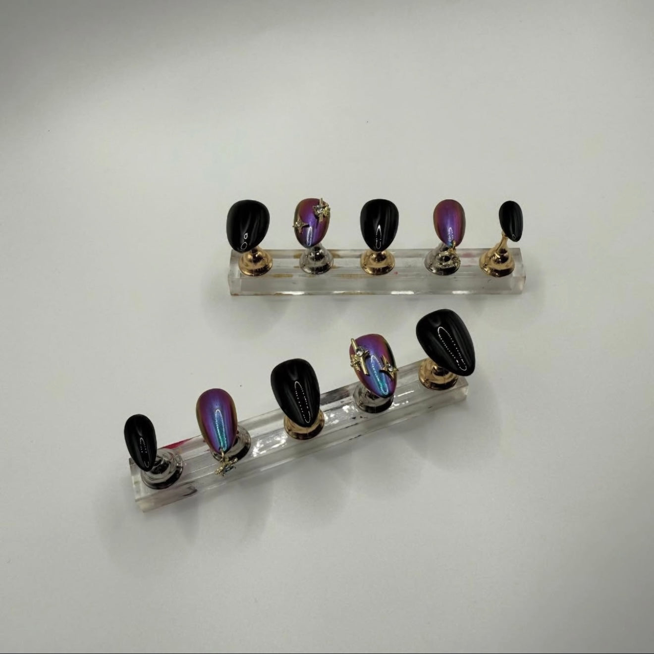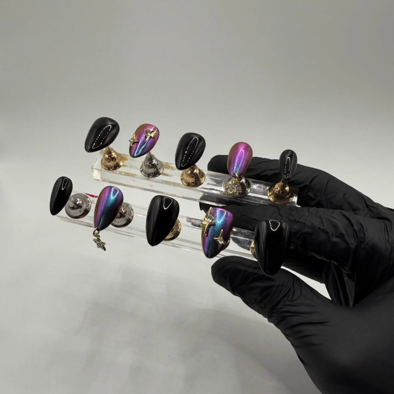 Set Shown Description: Glossy Black Nails with Rainbow Chrome Accent Nails & Gold/Diamond Sparkles+Star/Moon Diamond Dangle charms.