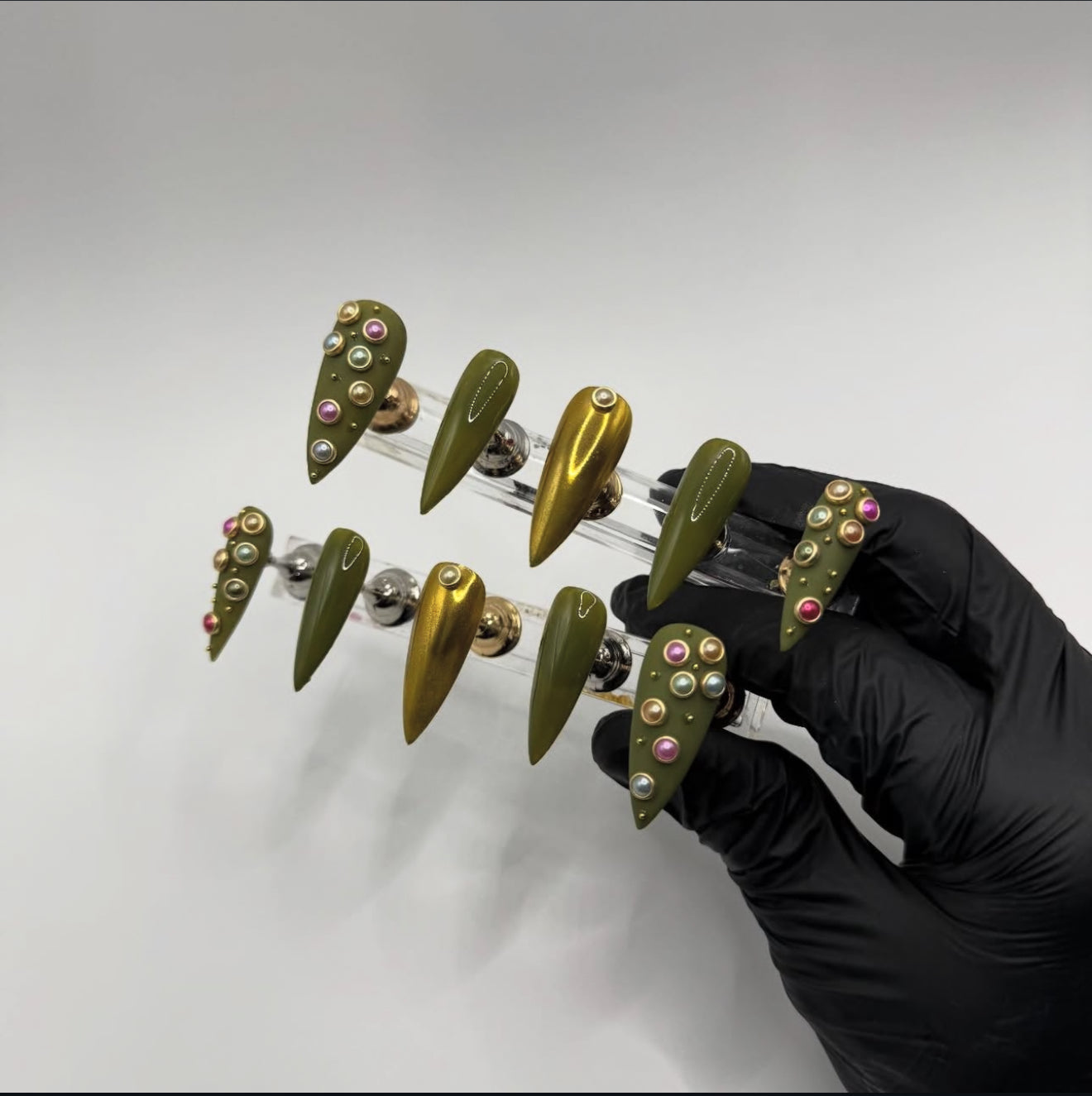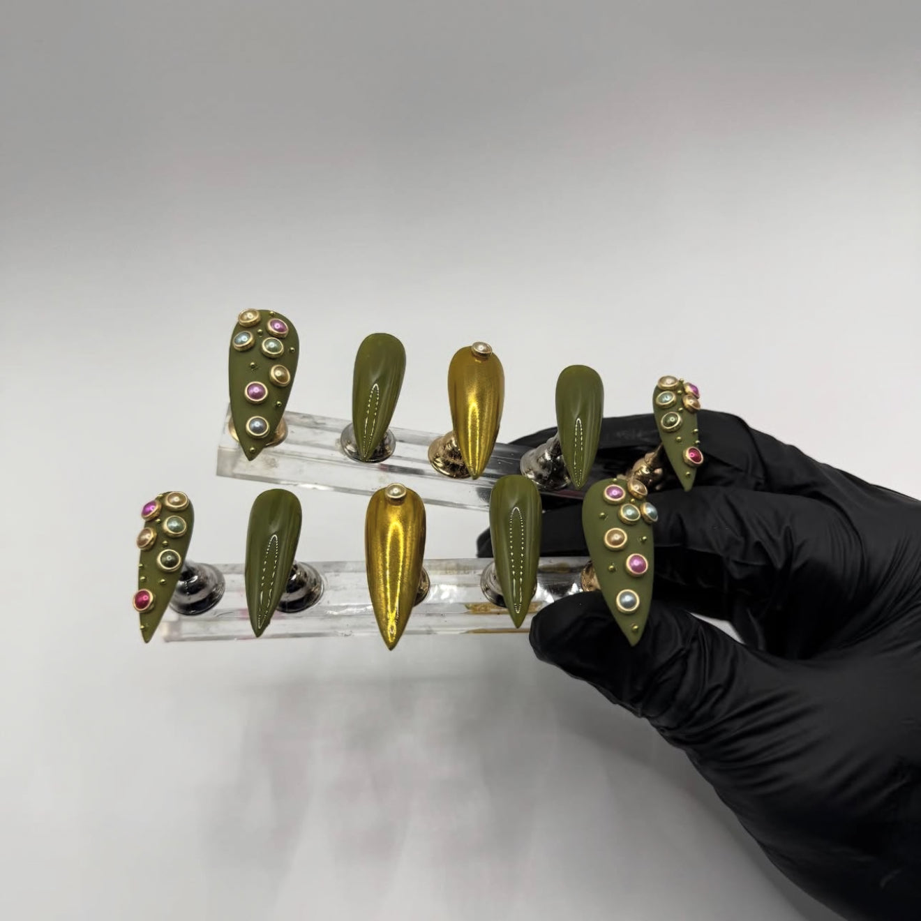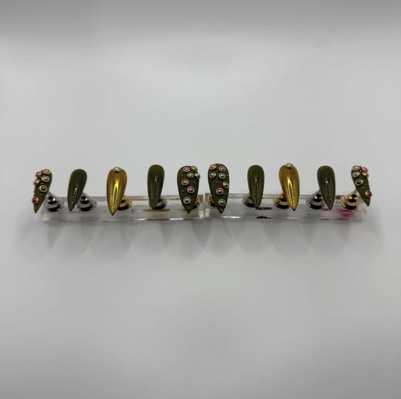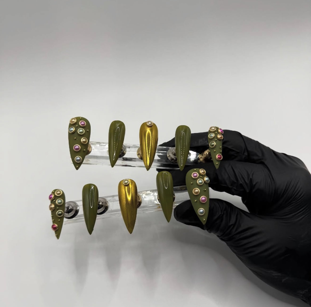 Set Shown Description: Matte Army Green Nails with Assorted Color Gold Opals, Glossy Army Green, & gold chrome with single gold opal..