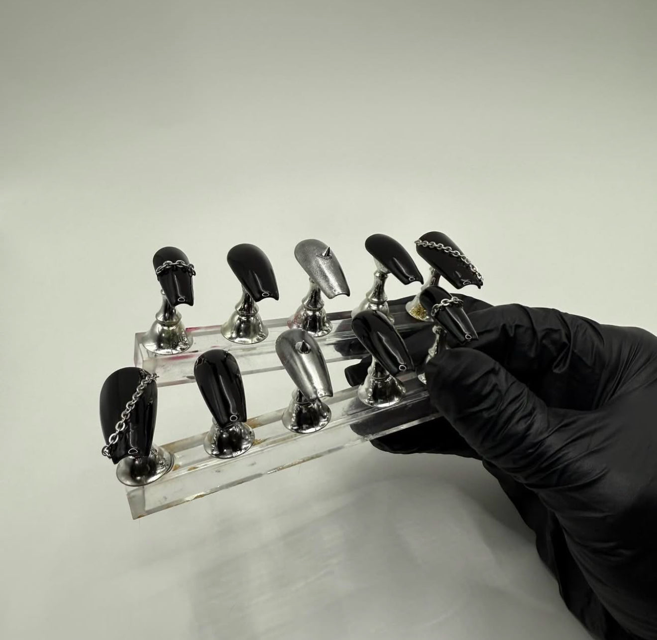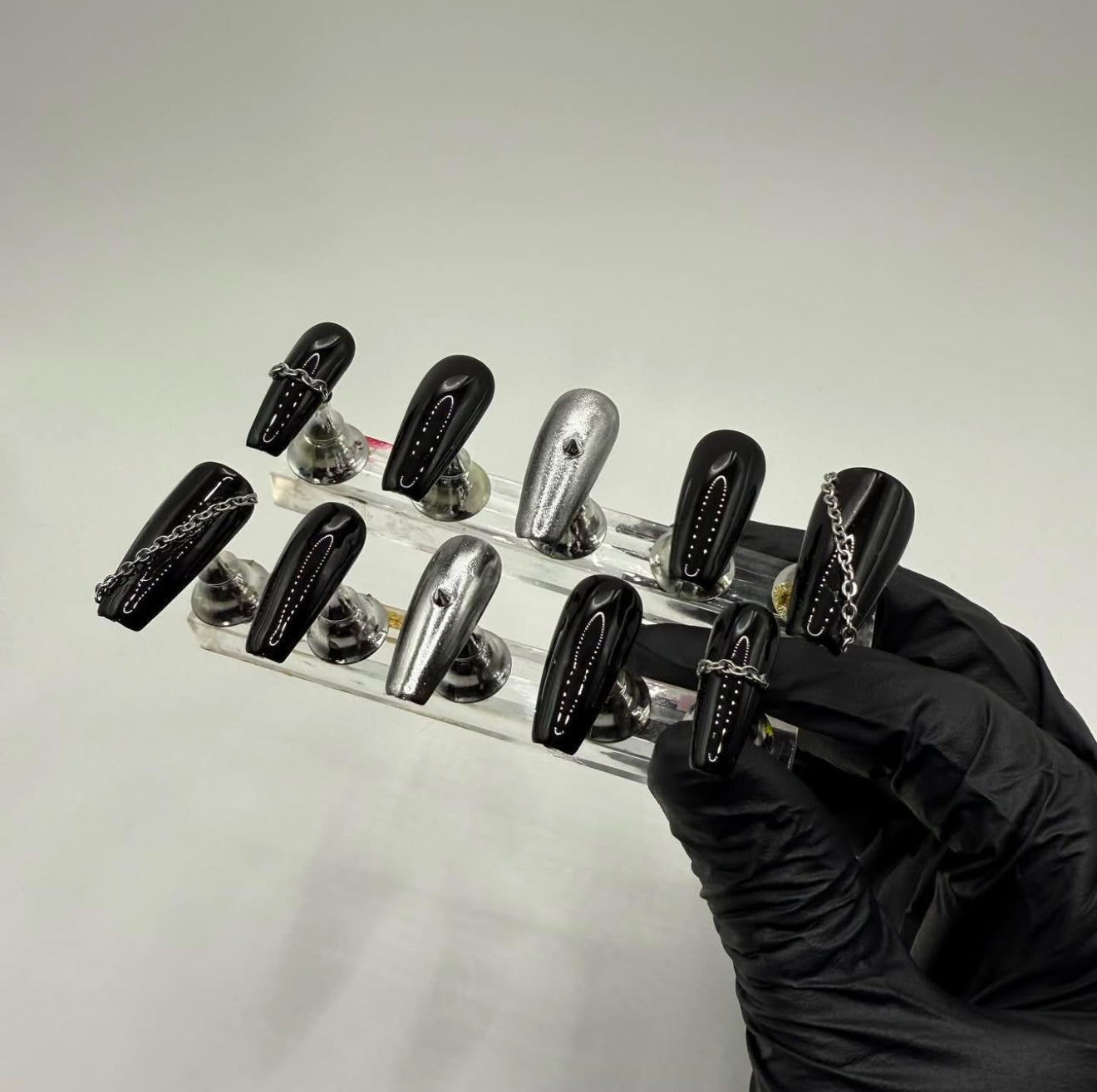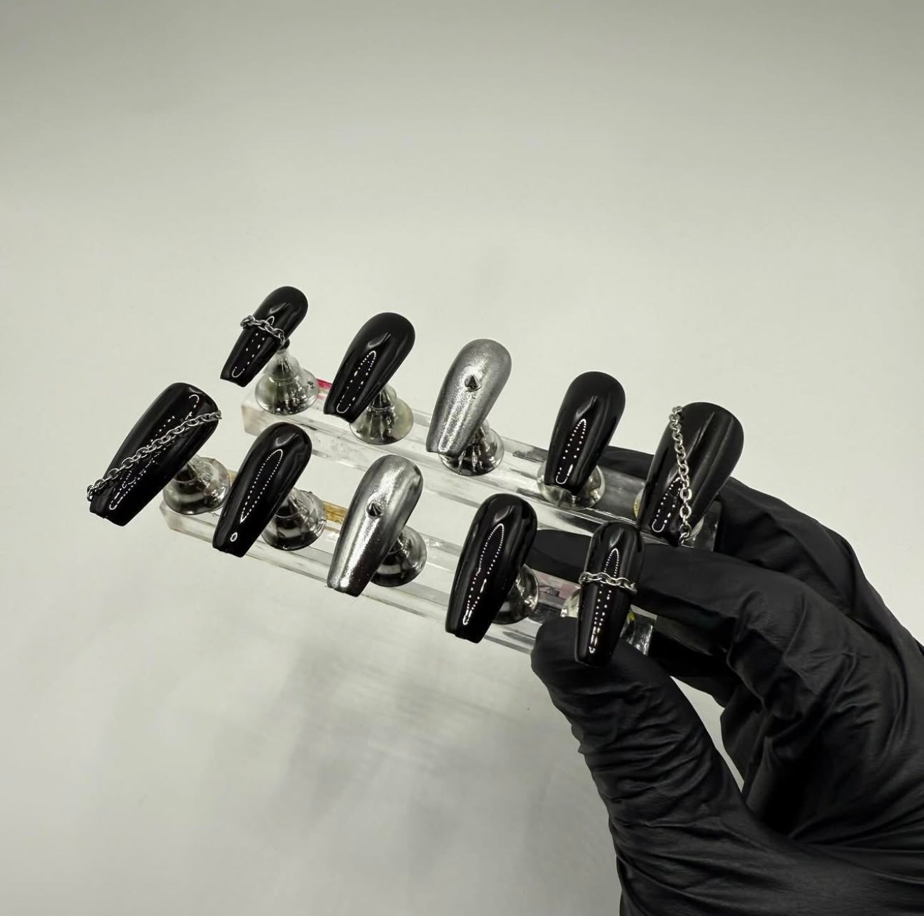 Set Shown Description: Glossy Midnight Black Base Nails with added metal chain/spike details & two chrome silver nails!