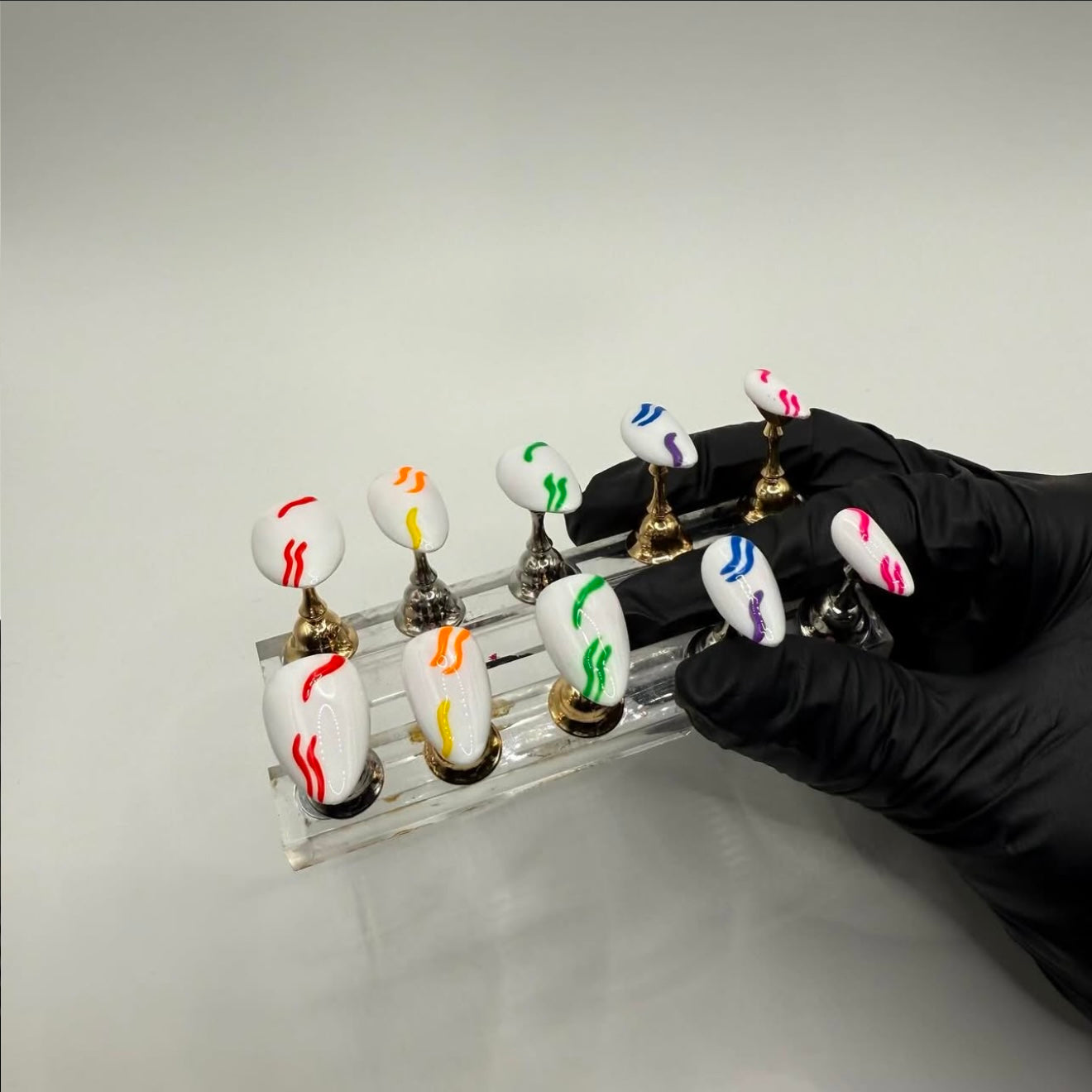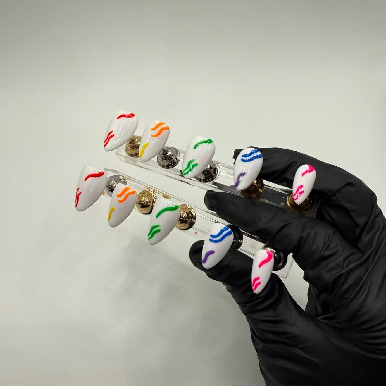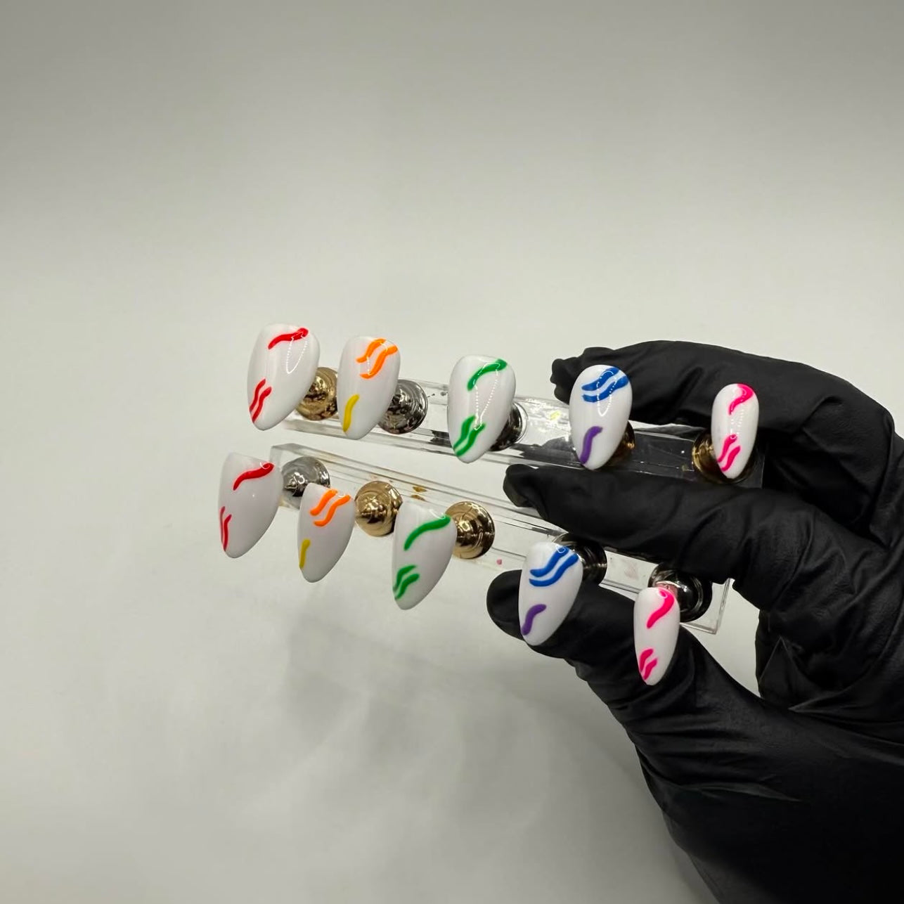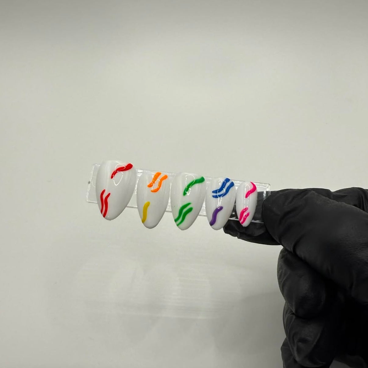 Set Shown Description: Glossy White Base Nails with Rainbow “waves” (slightly textured)
