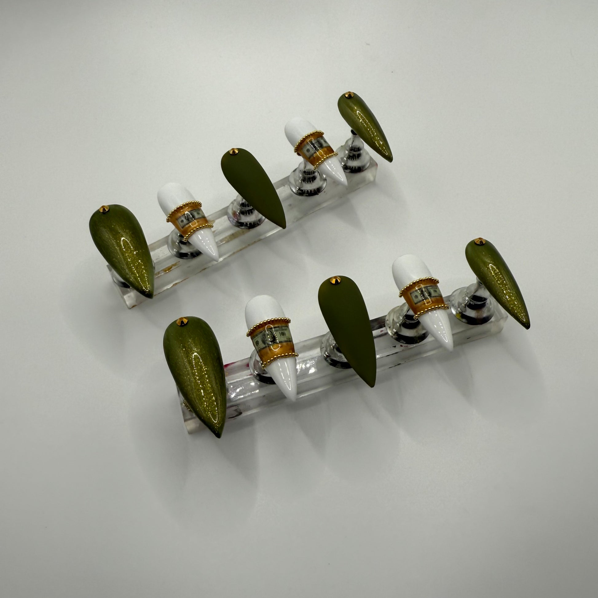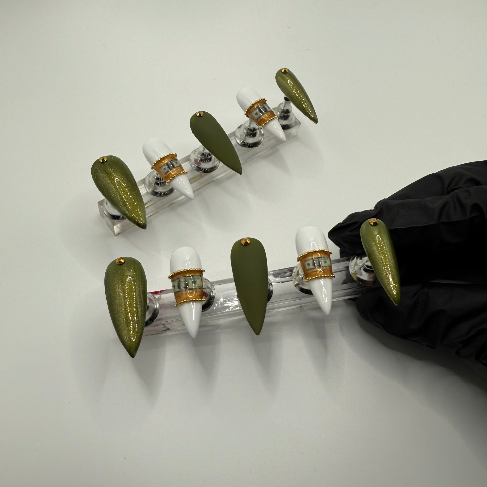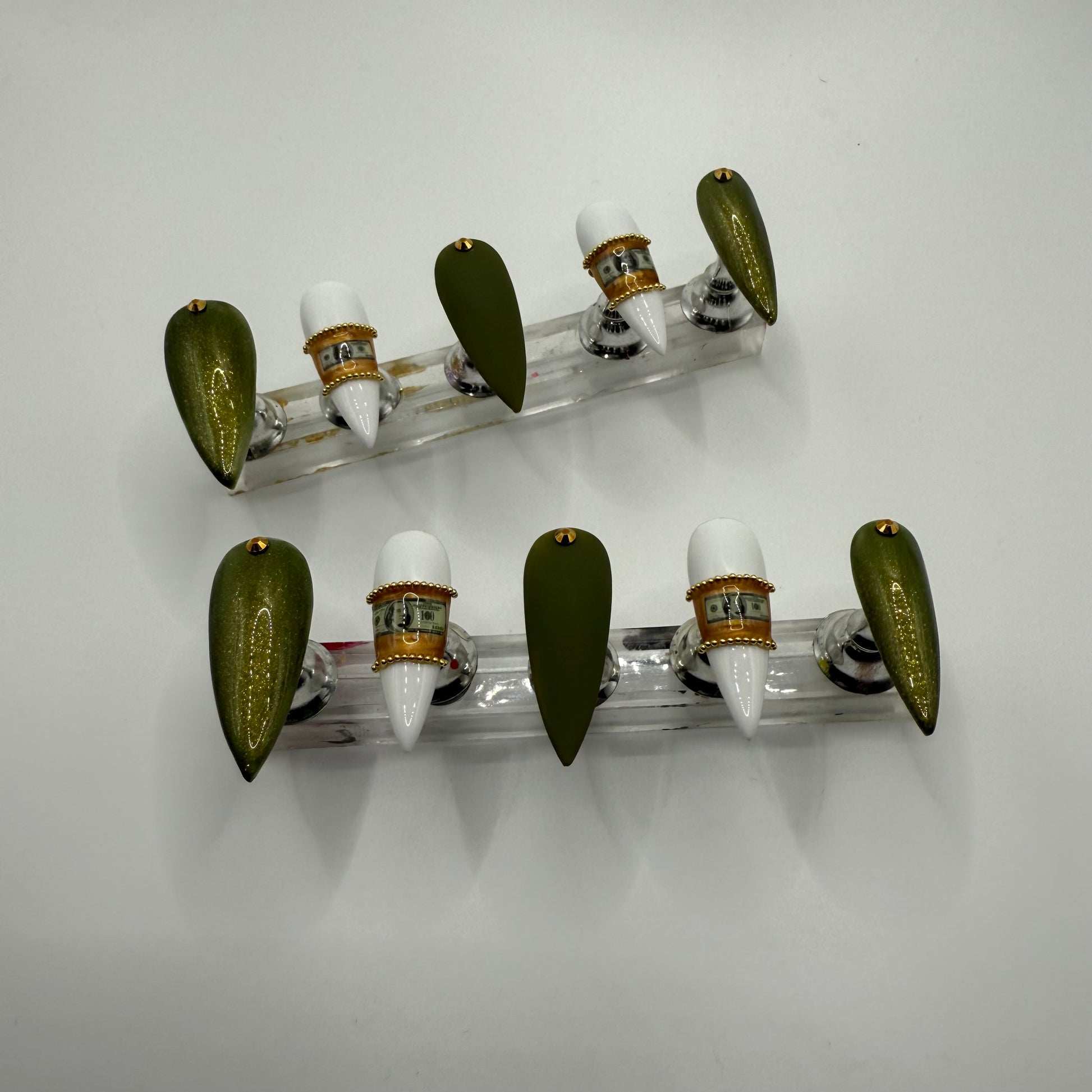 Set Shown Description: A Money manifestation set to DROP JAWS. Chrome green/gold nails, white/money/gold accent nails, and matte green “money bill” accent nail..
