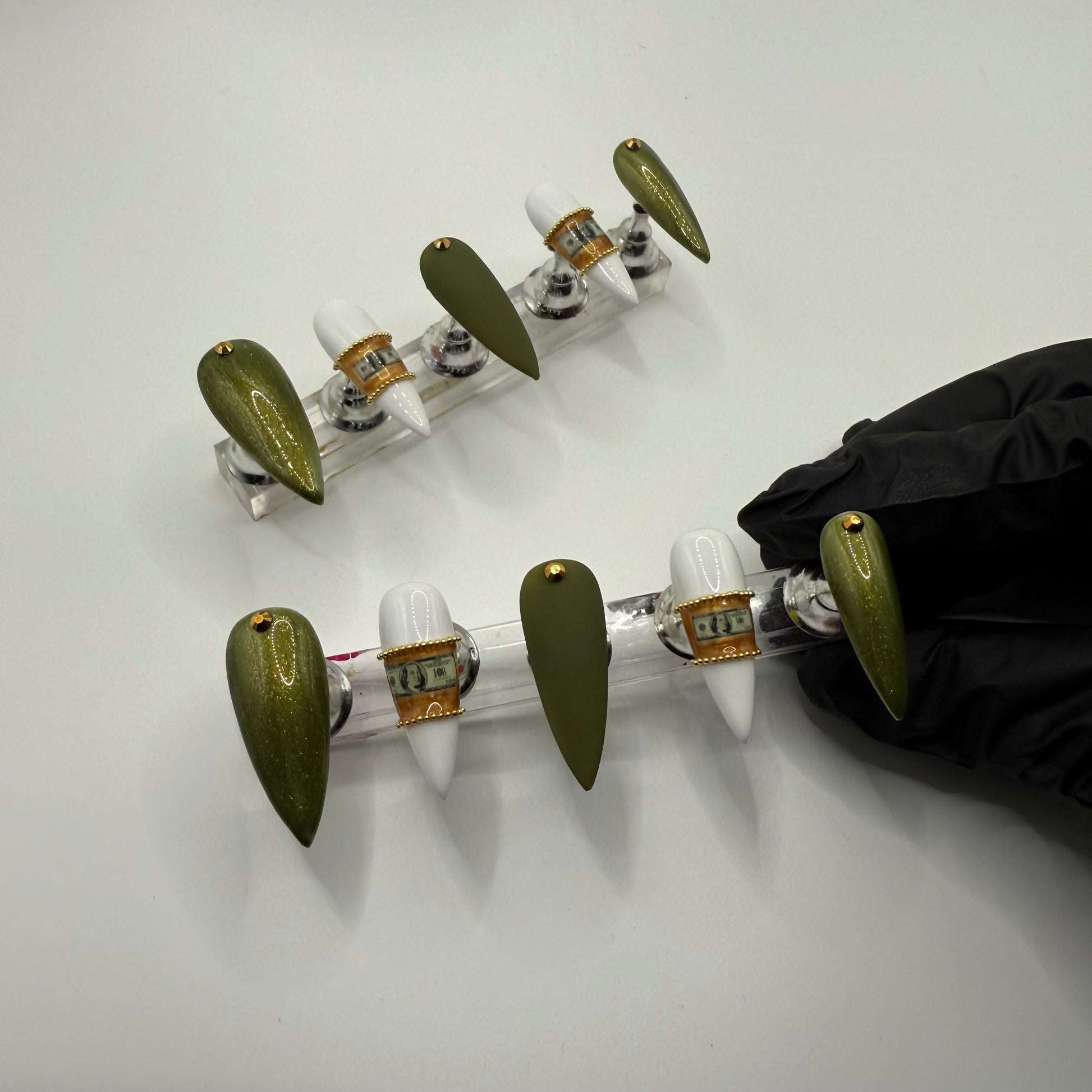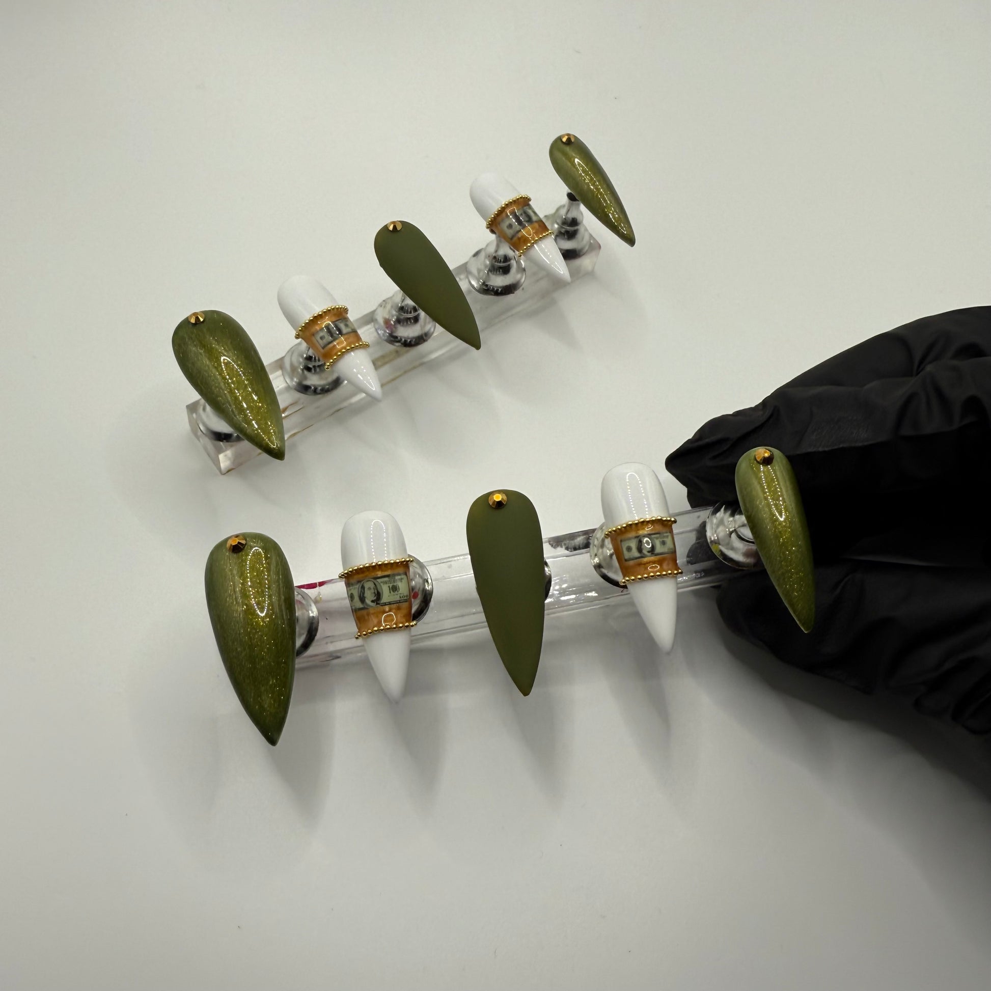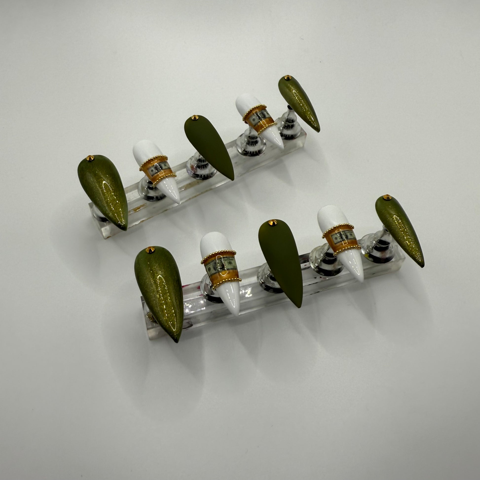 Set Shown Description: A Money manifestation set to DROP JAWS. Chrome green/gold nails, white/money/gold accent nails, and matte green “money bill” accent nail..