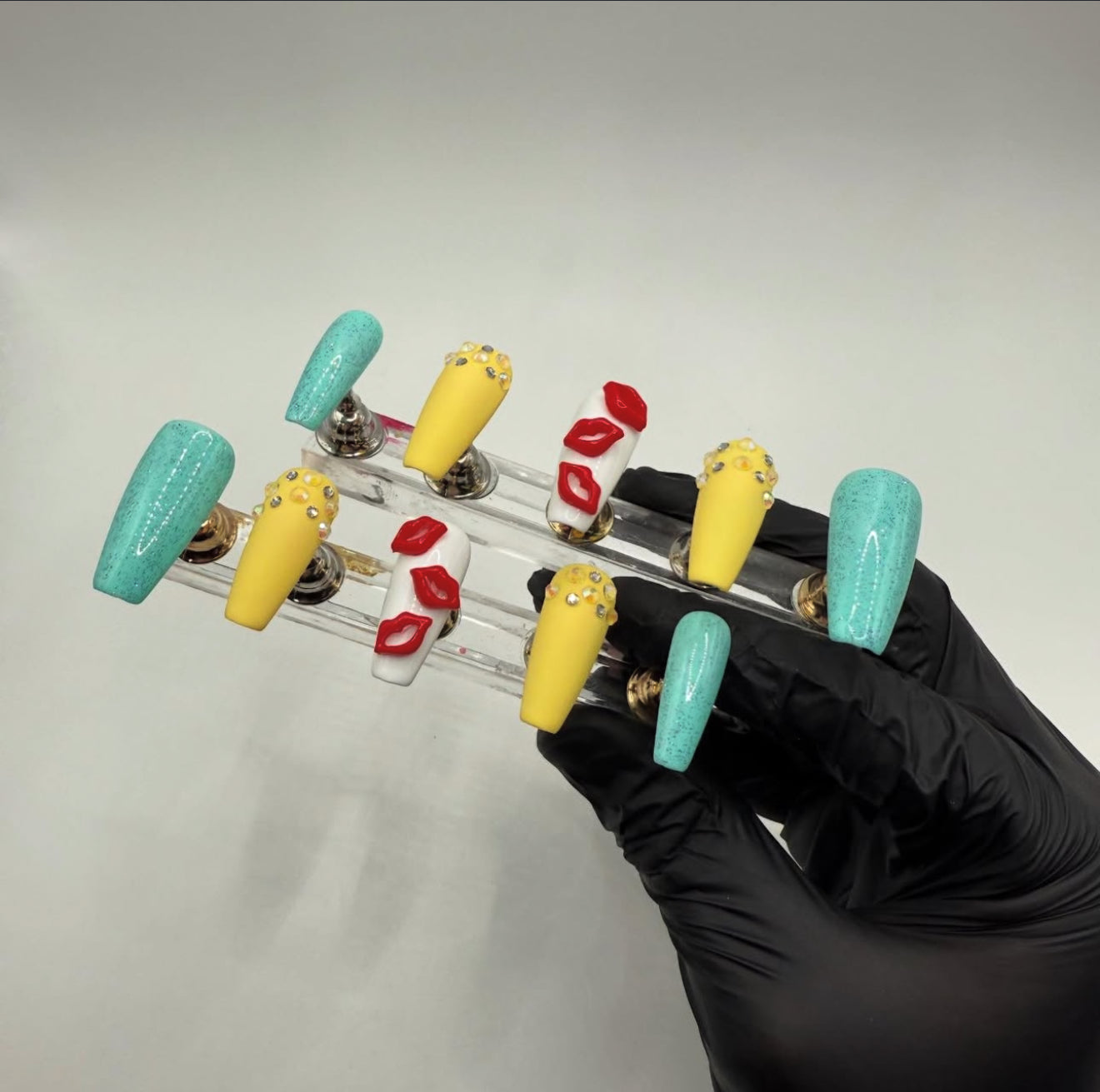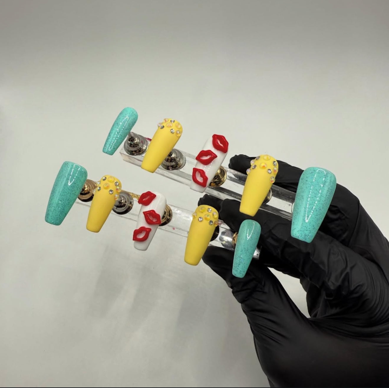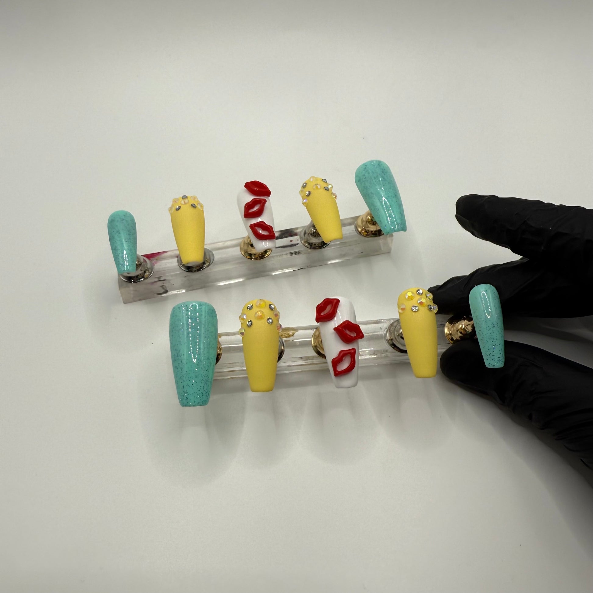 Set Shown Description: Glossy Blue Nails with Glitter Topcoat, Yellow Matte Nails with Clear/AB Rhinestones, & a white glossy nail with 3D Red Lips.