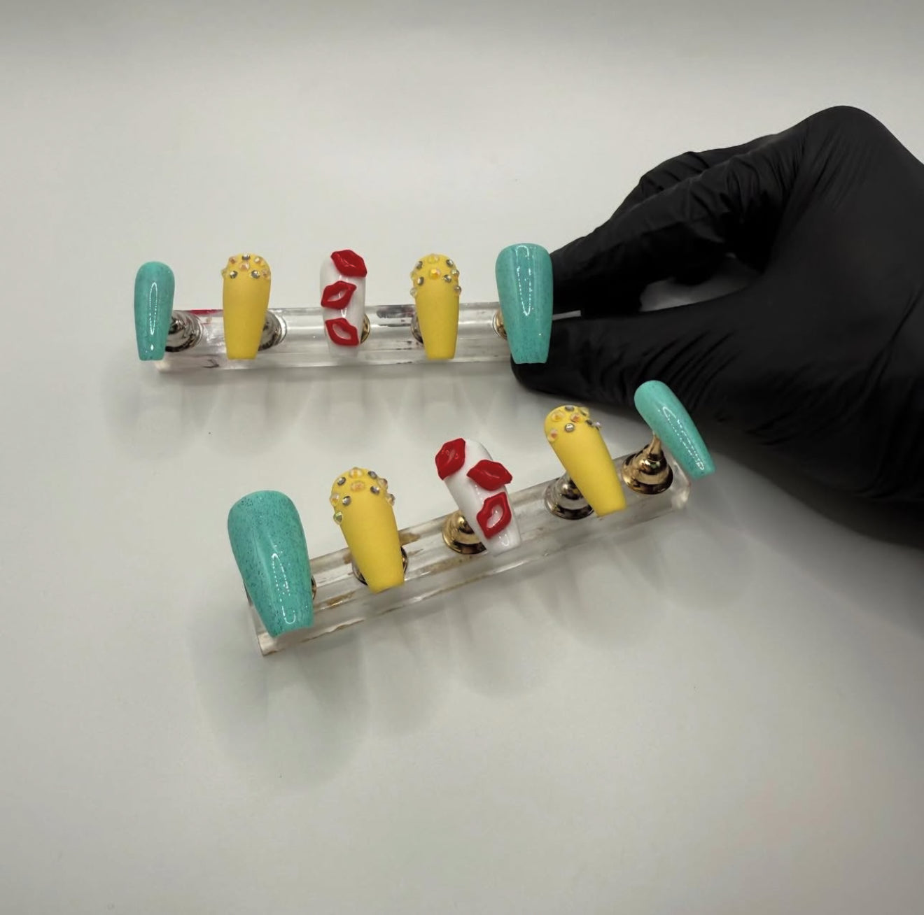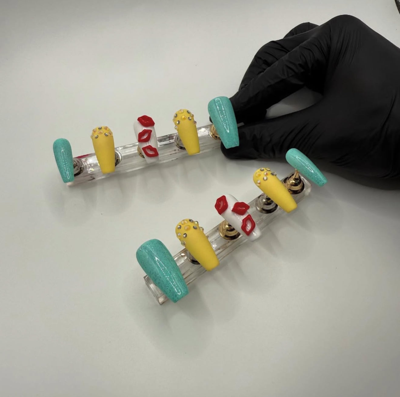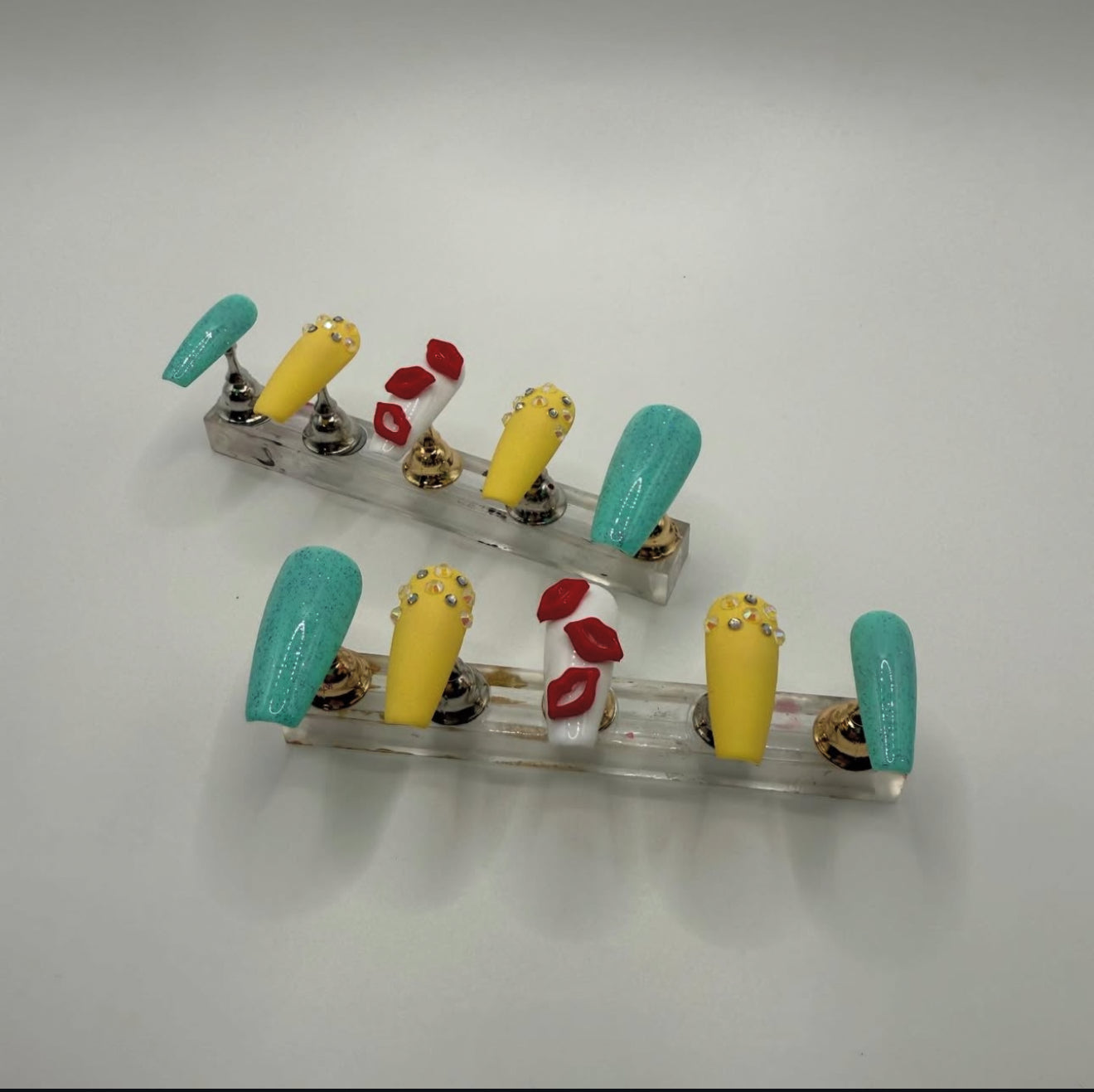 Set Shown Description: Glossy Blue Nails with Glitter Topcoat, Yellow Matte Nails with Clear/AB Rhinestones, & a white glossy nail with 3D Red Lips.