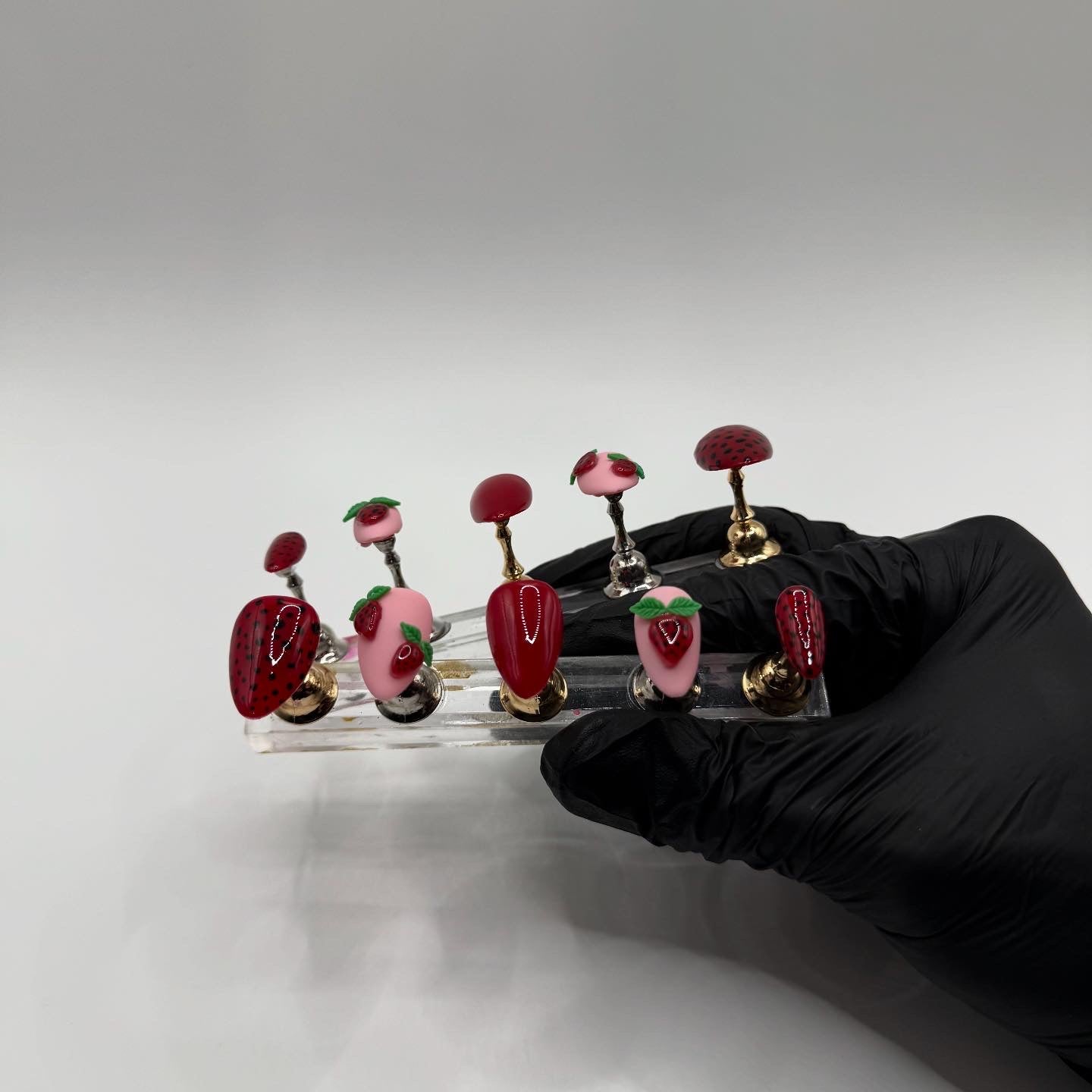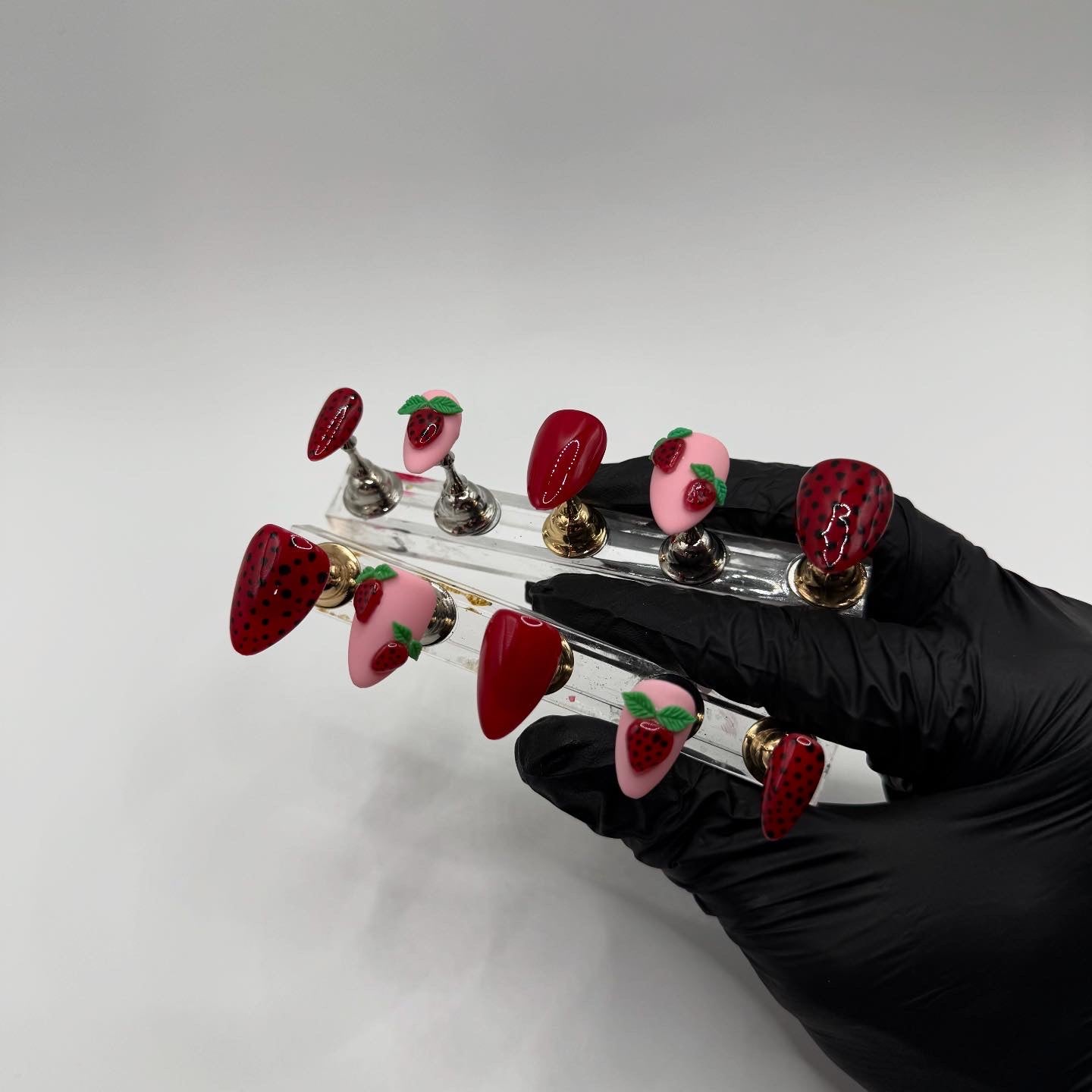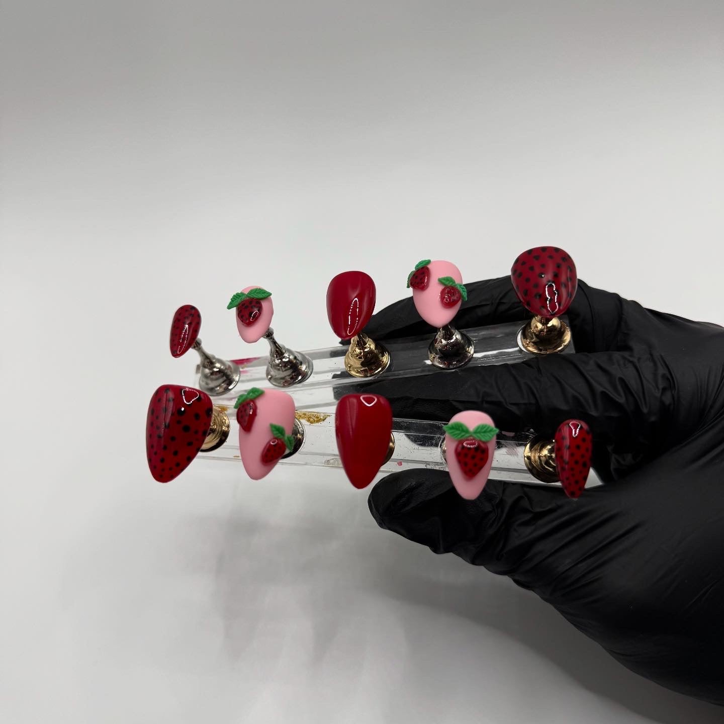 Set Shown Description: Glossy Red Strawberry “Magnified ” Nails with Nude Pink matte accent nails with 3D berries / leaves.