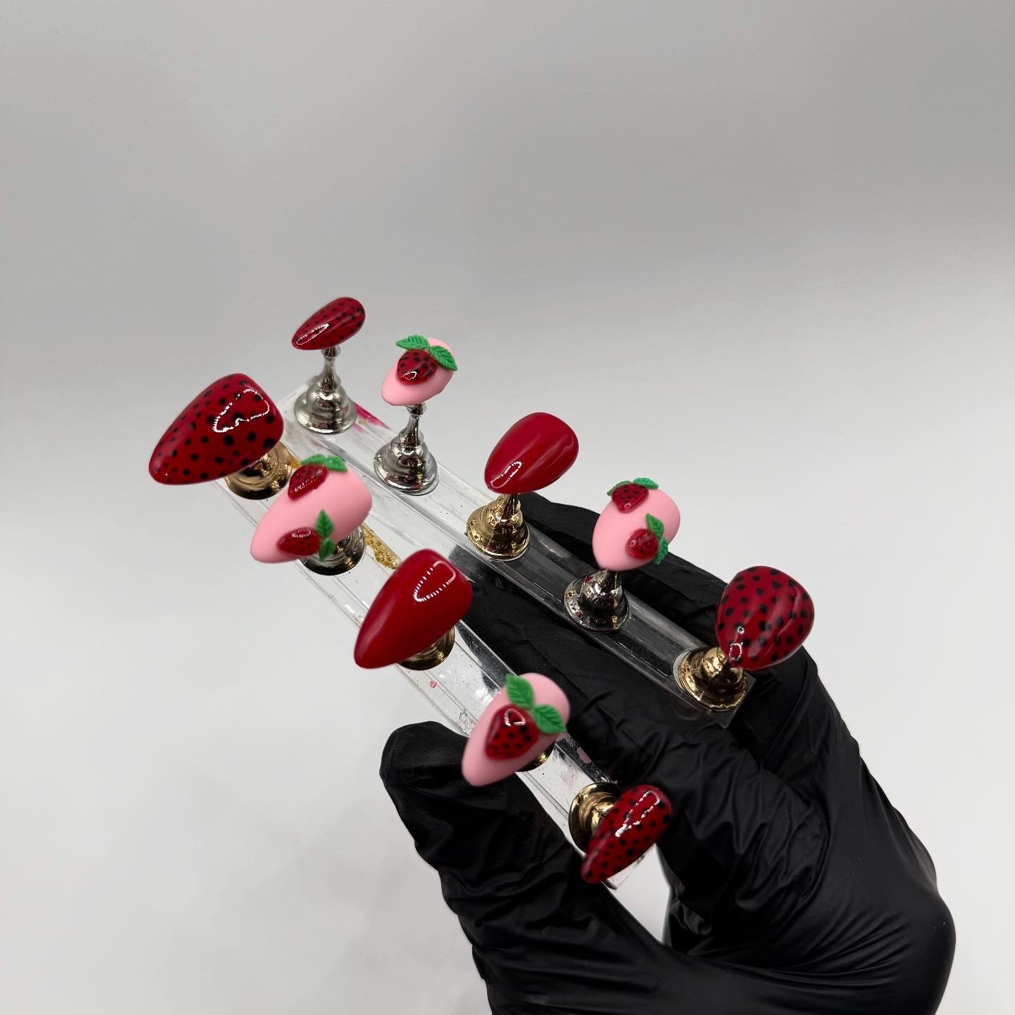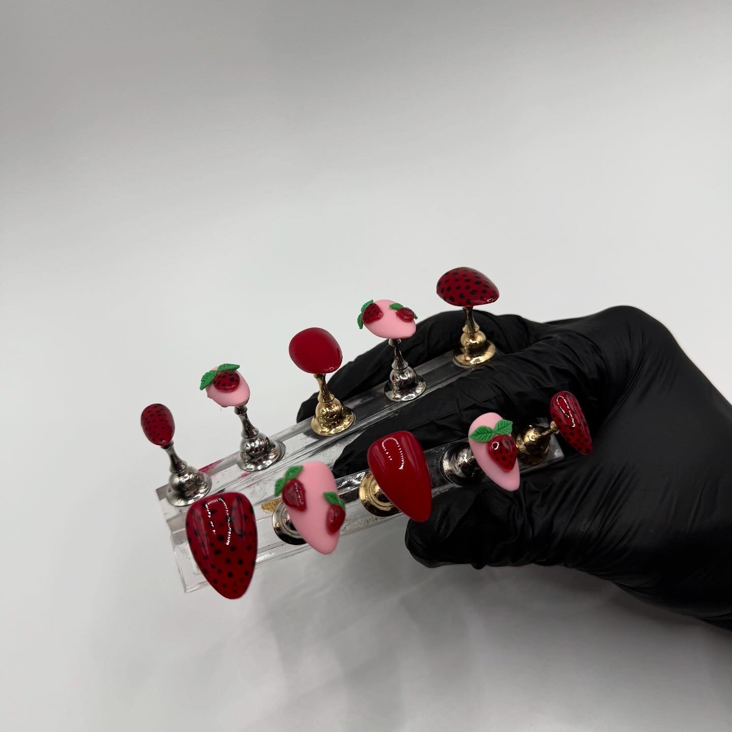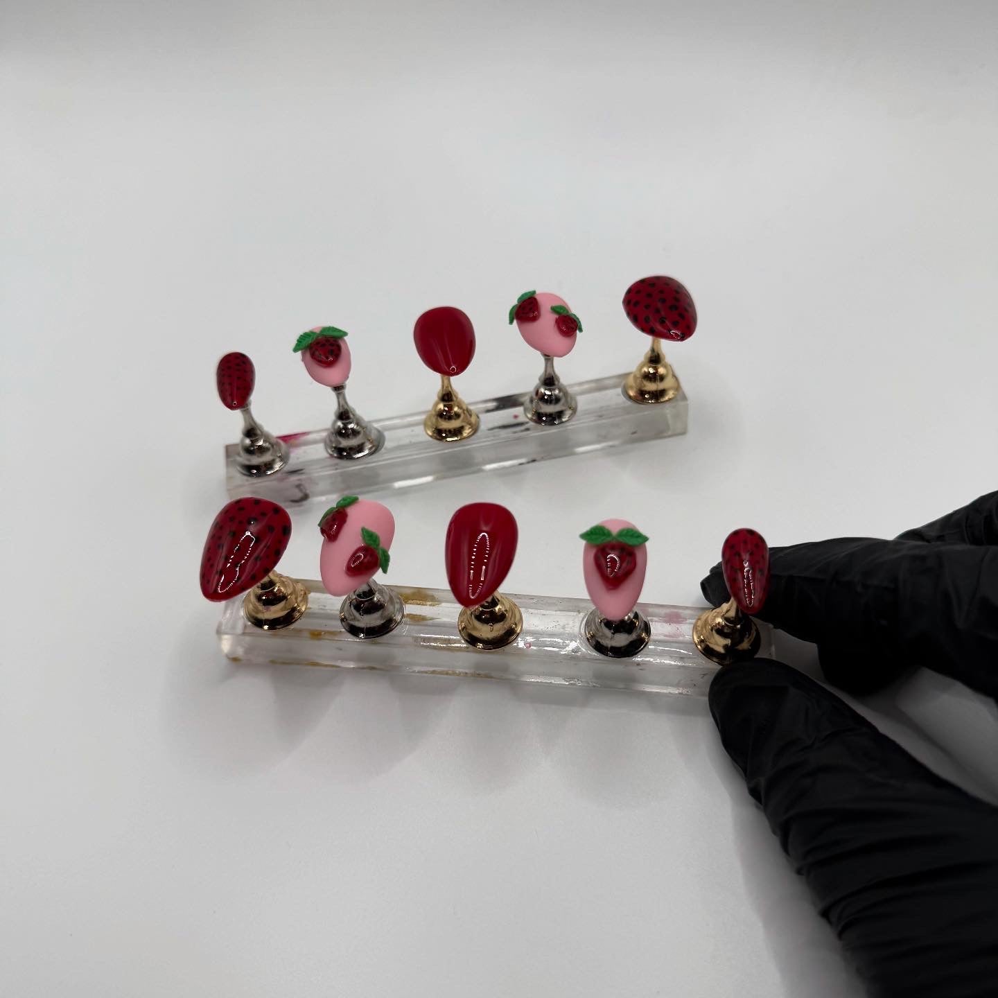 Set Shown Description: Glossy Red Strawberry “Magnified ” Nails with Nude Pink matte accent nails with 3D berries / leaves.