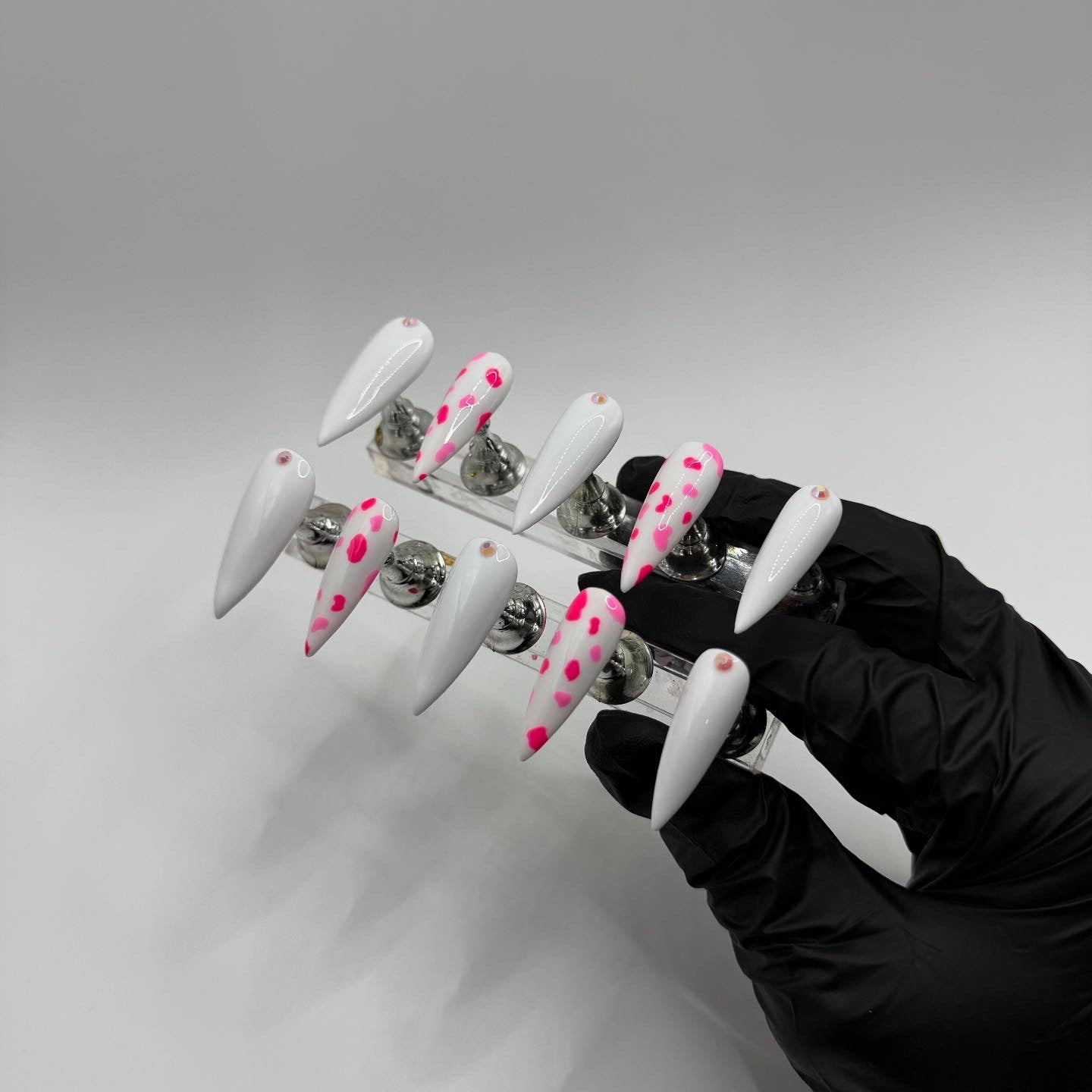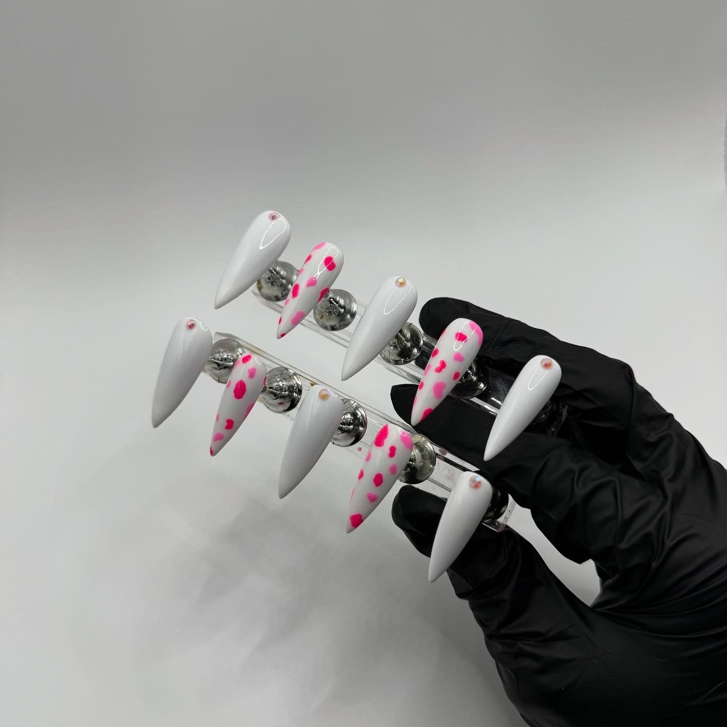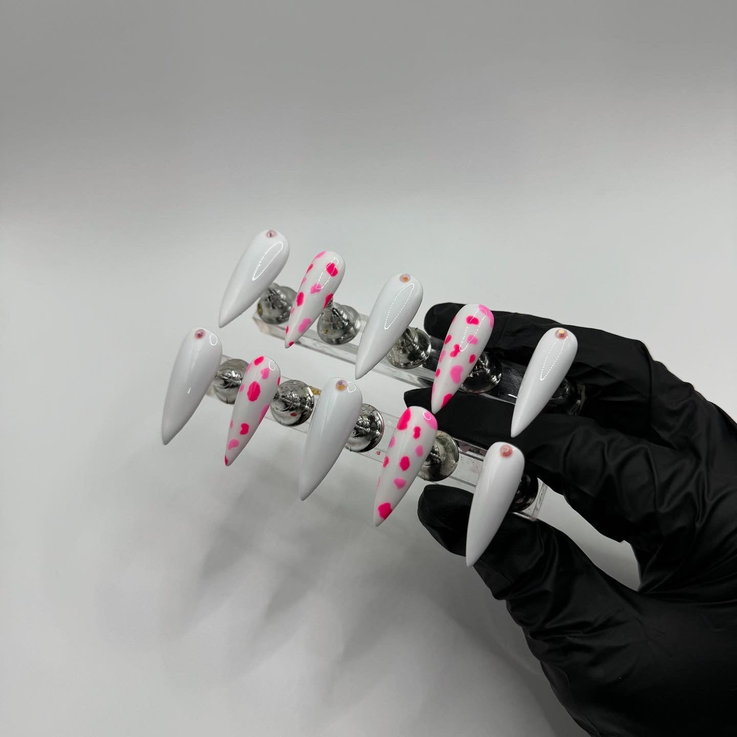 Set Shown Description: Glossy White Base Nails with pink mix “cow print” & pink rhinestone detailing.