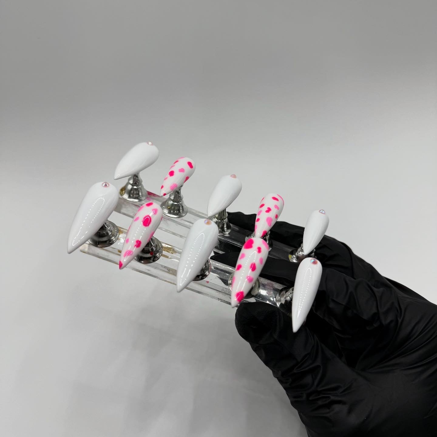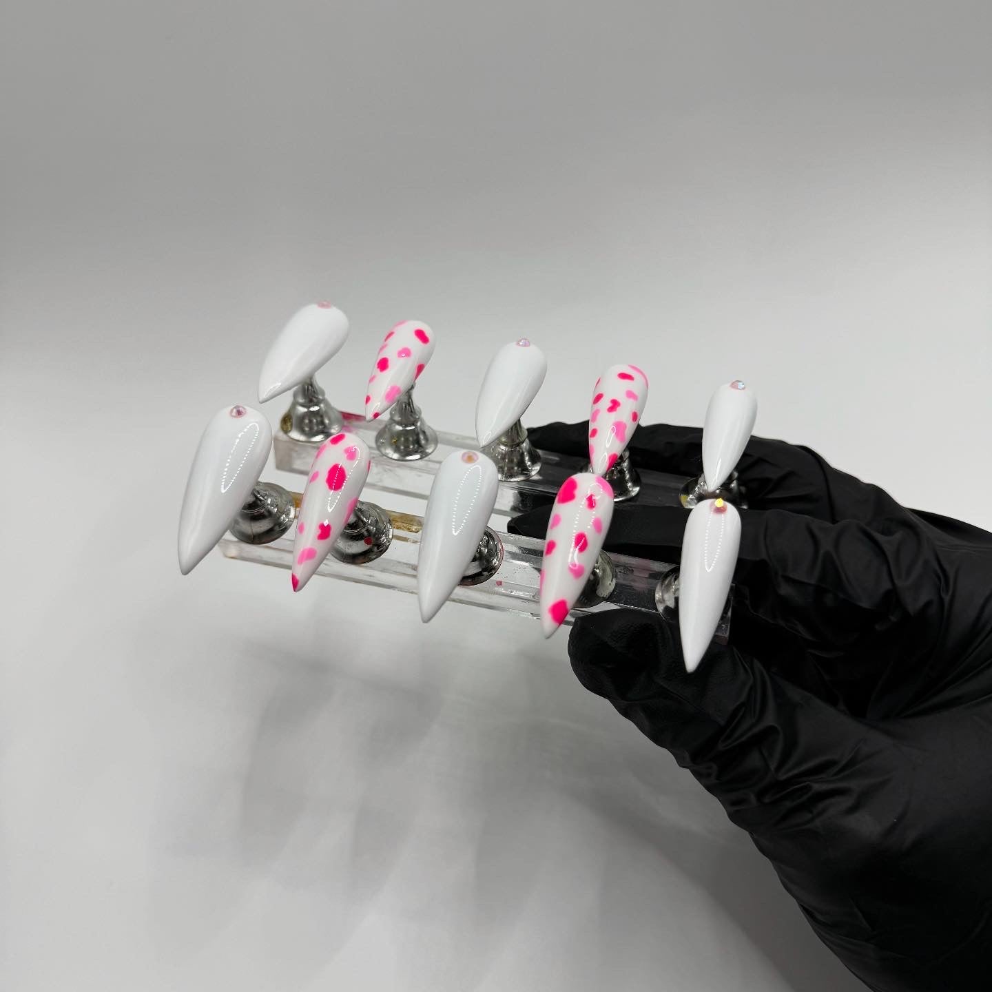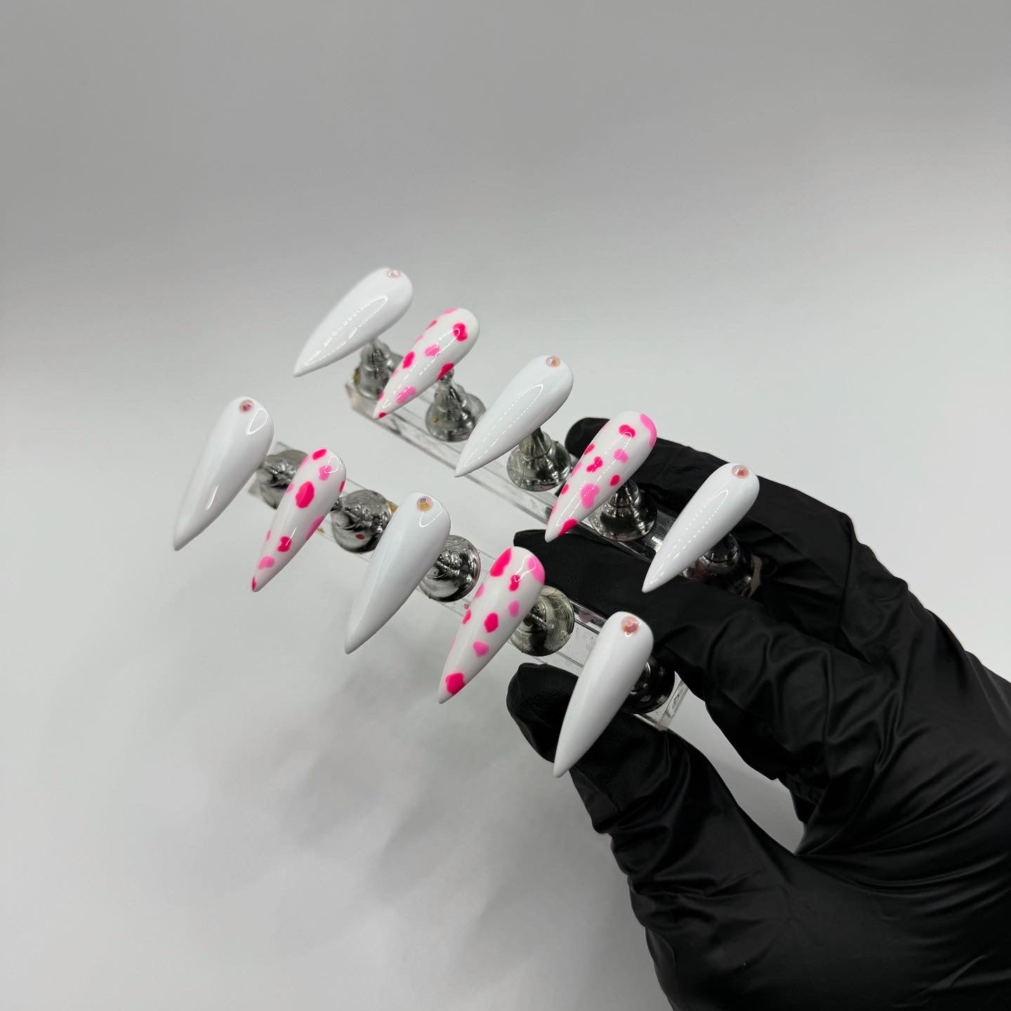 Set Shown Description: Glossy White Base Nails with pink mix “cow print” & pink rhinestone detailing.