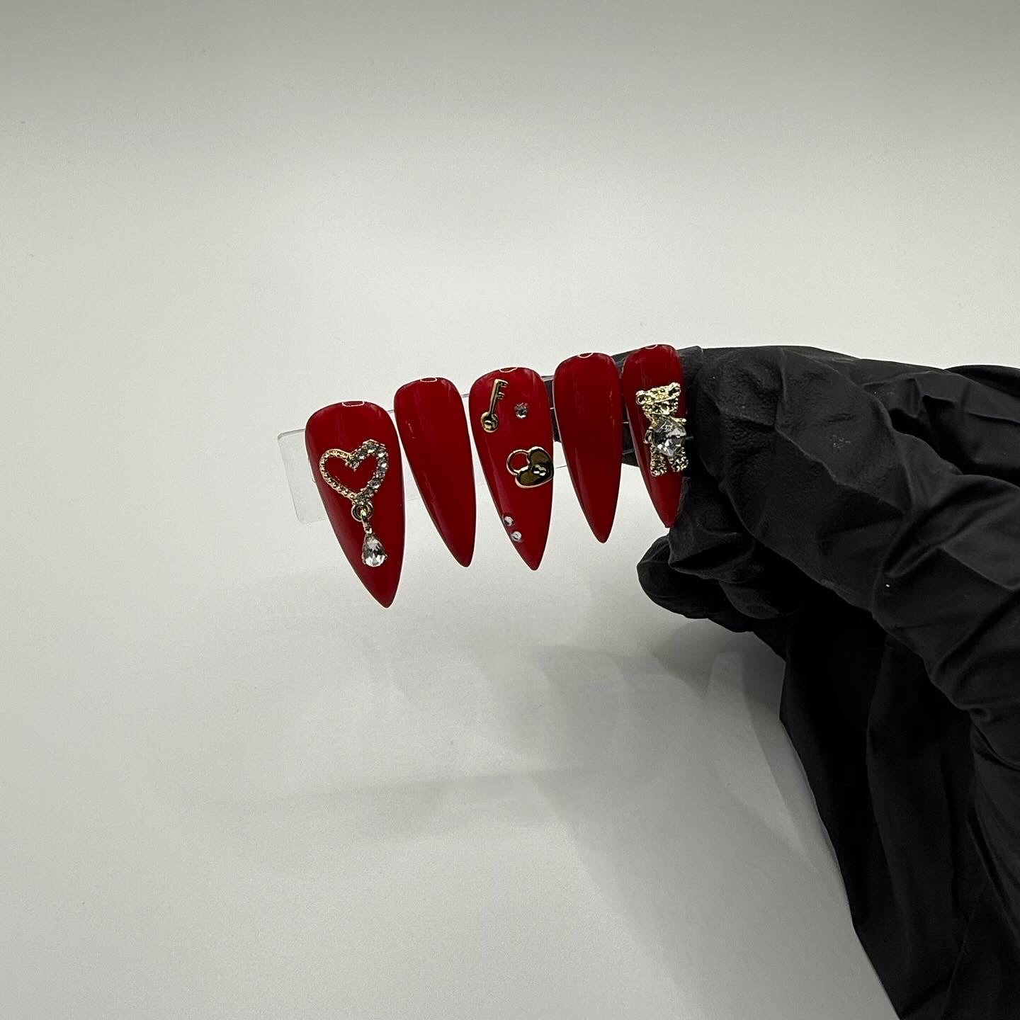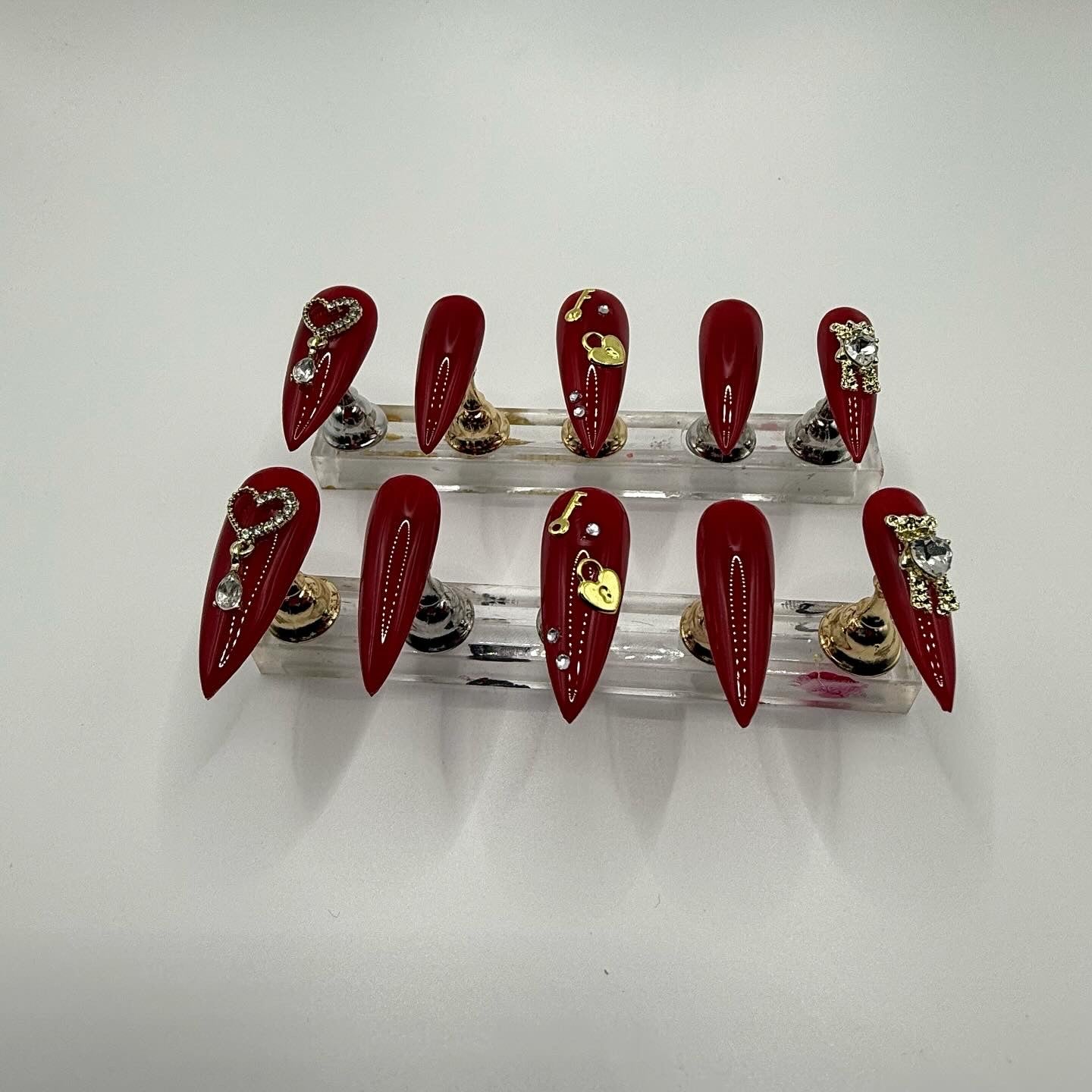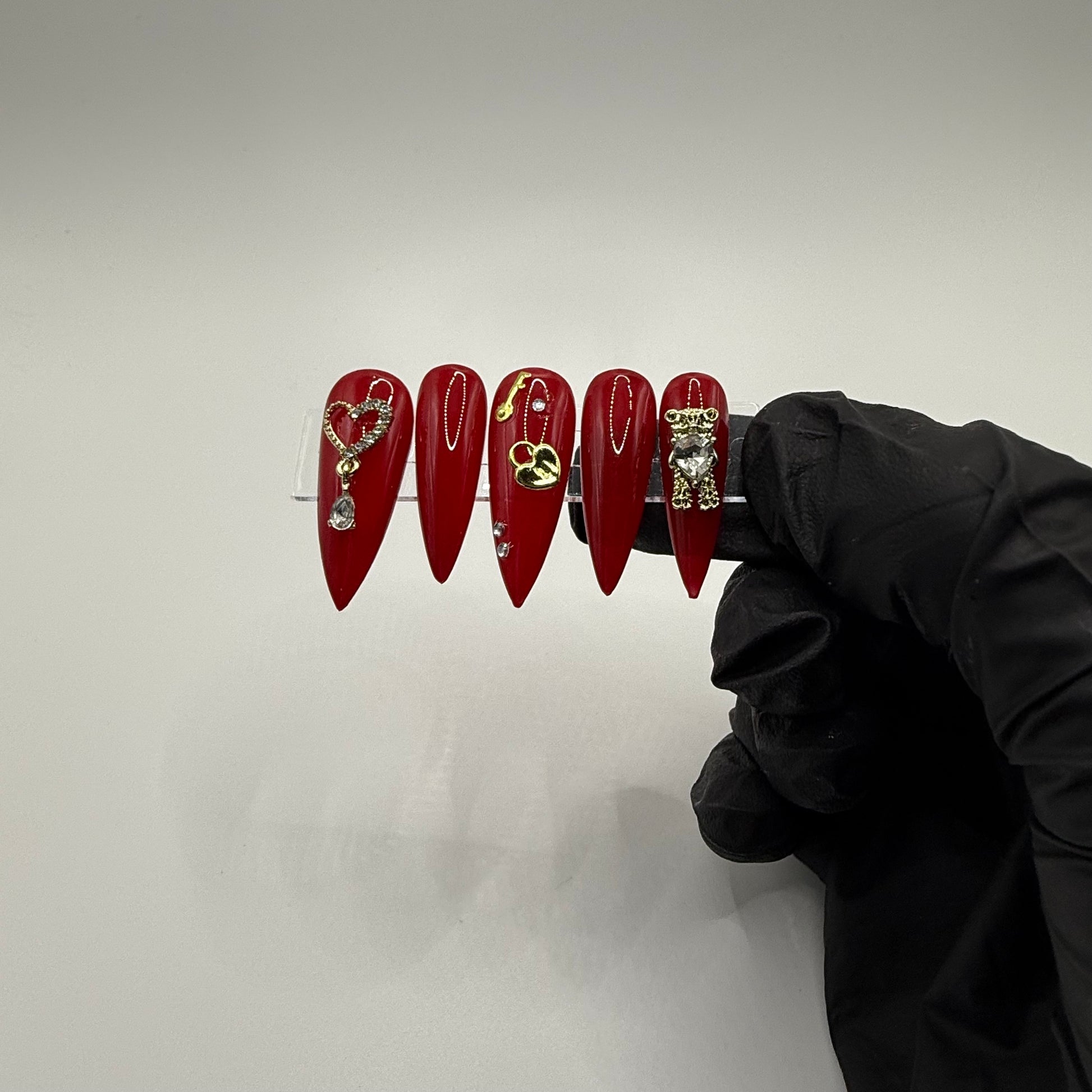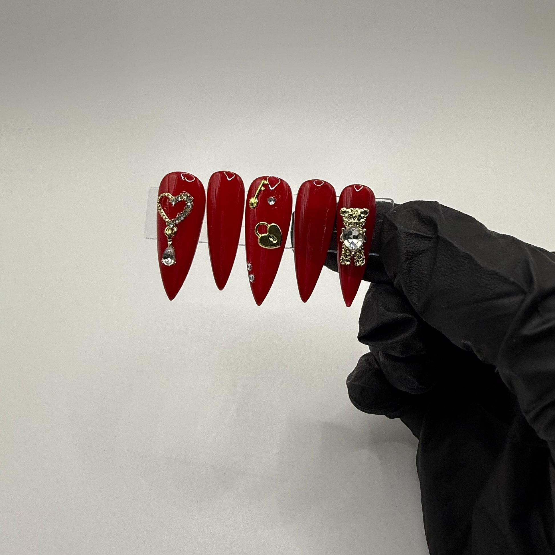 Set Shown Description: Glossy Medium Dark Red with Gold/Diamond Details - including dangly heart, bear, and lock/key!