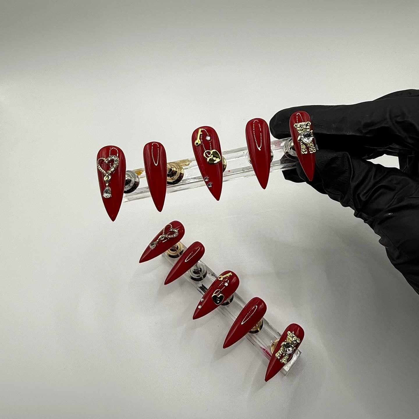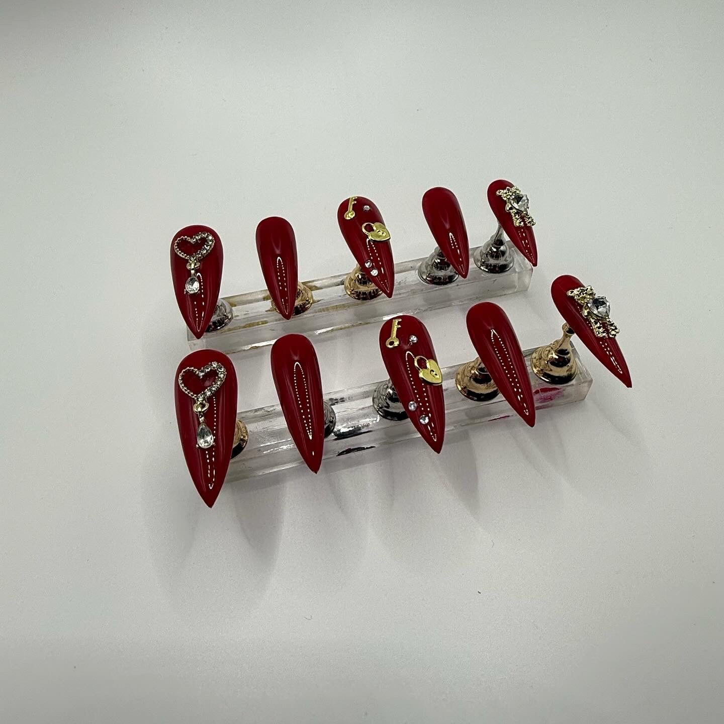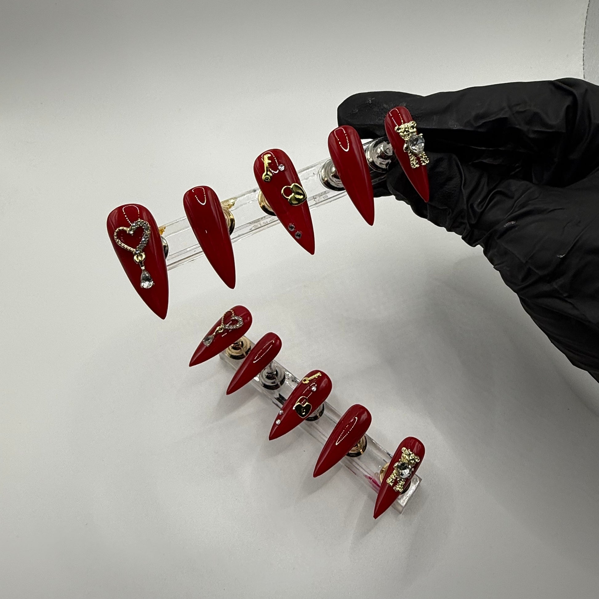 Set Shown Description: Glossy Medium Dark Red with Gold/Diamond Details - including dangly heart, bear, and lock/key!