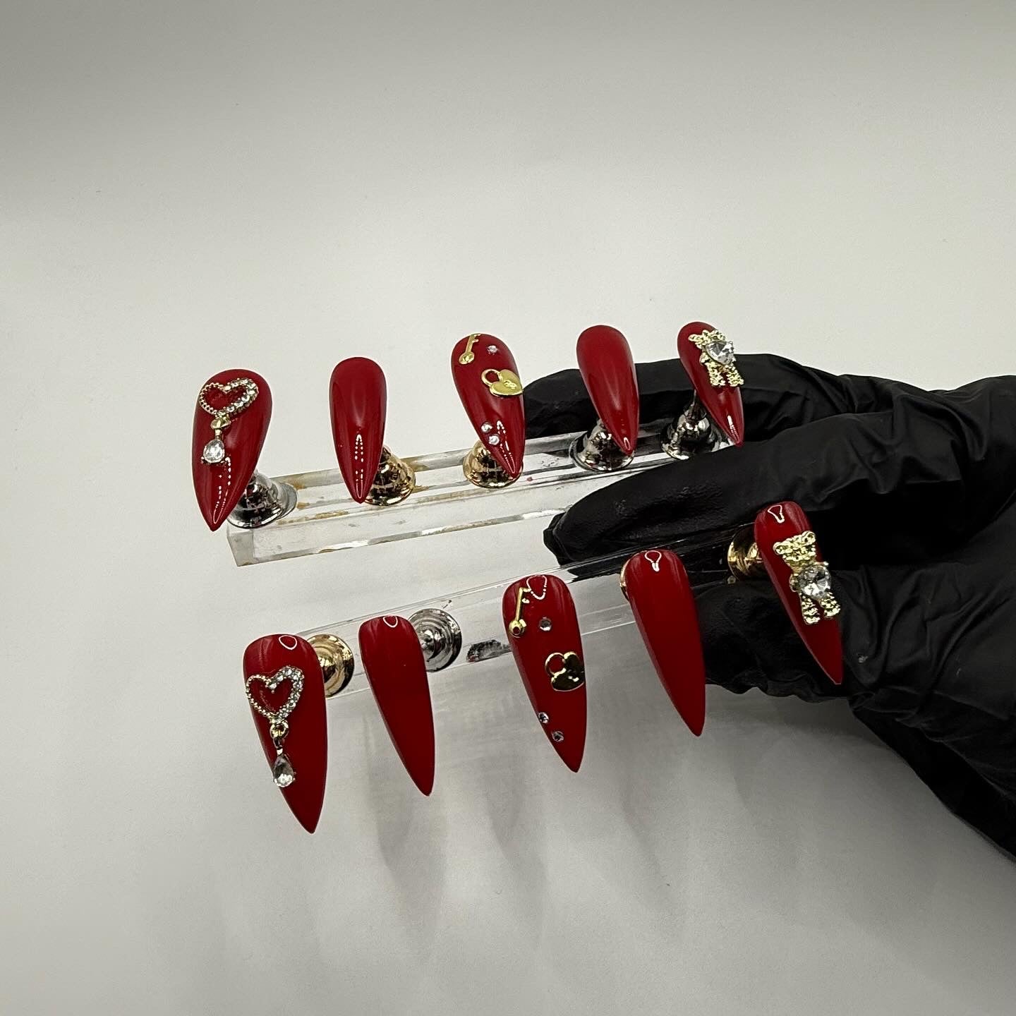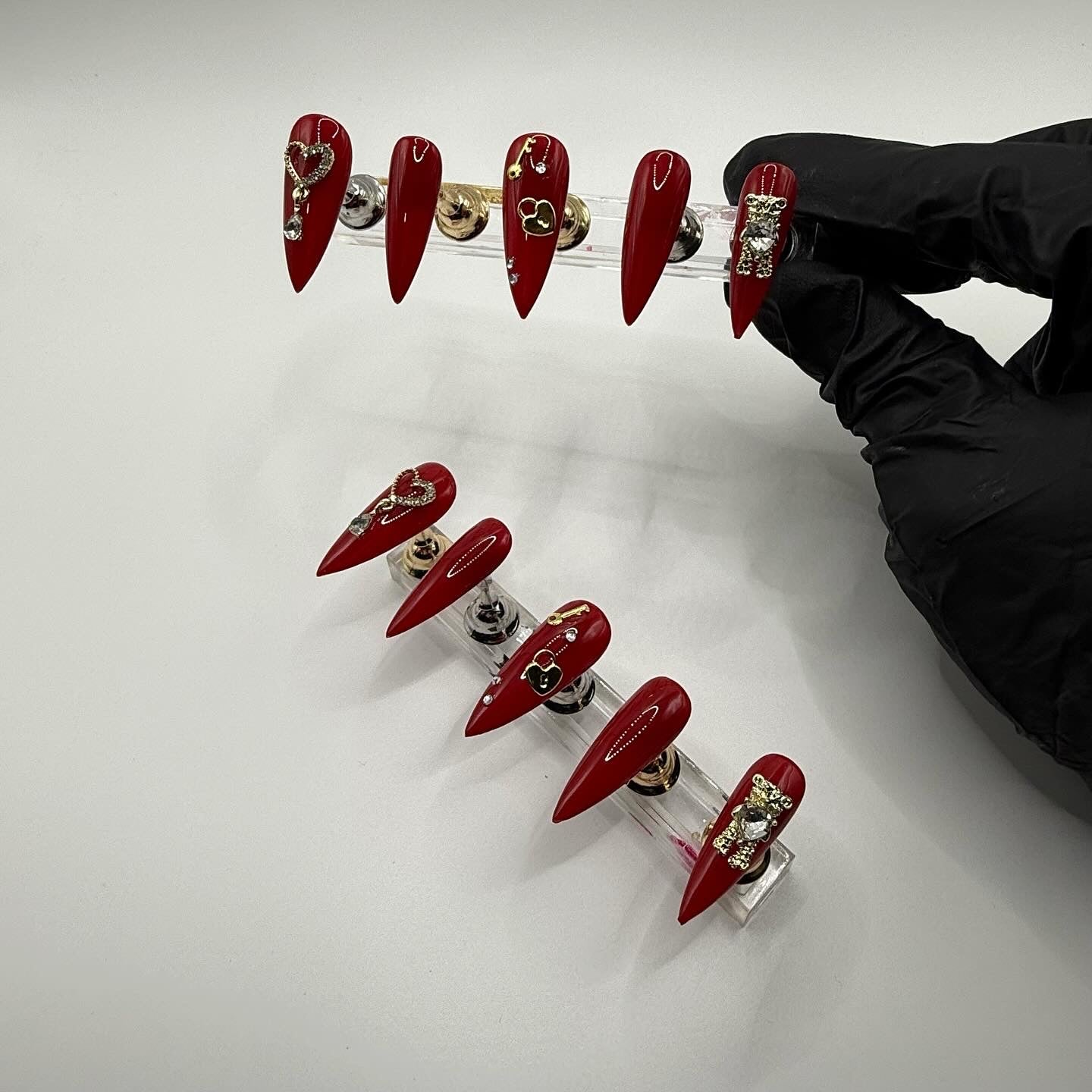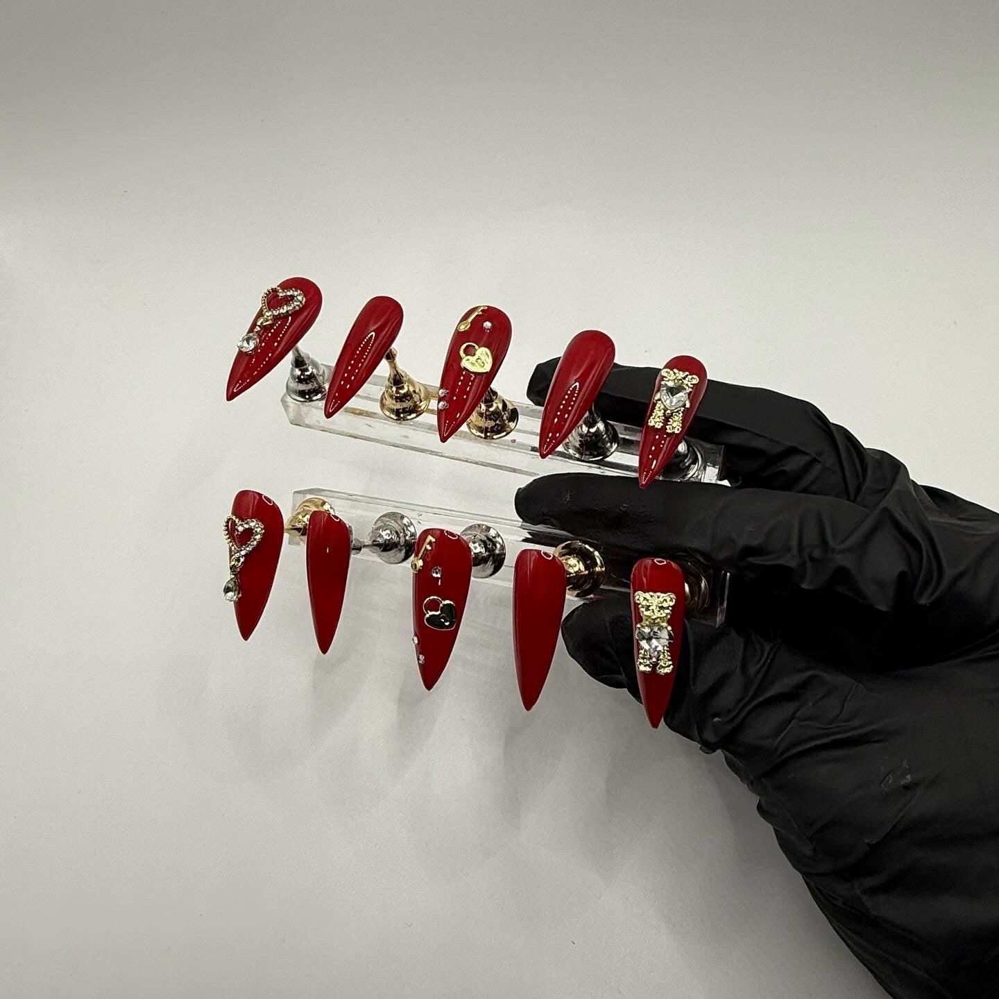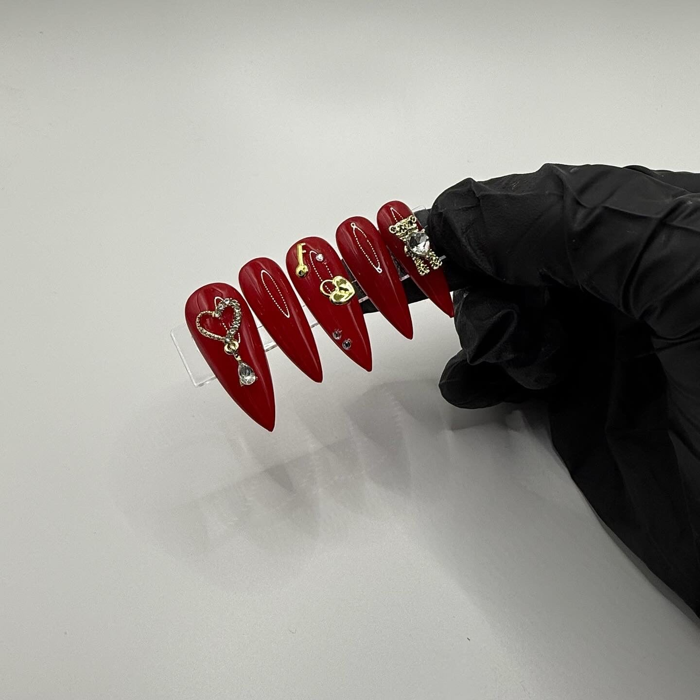 Set Shown Description: Glossy Medium Dark Red with Gold/Diamond Details - including dangly heart, bear, and lock/key!